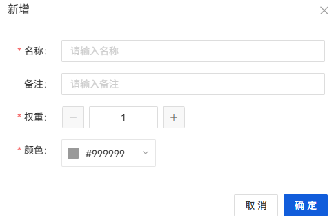 信息 说明 名称 严重性规则名称。 备注 严重性规则描述备注。 权重 严重性自定义标识。 颜色 严重性自定义颜色标识。