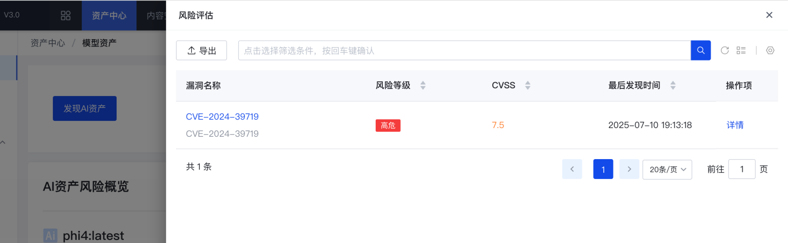 模型资产页面,可查看模型资产风险概览和风险详情。