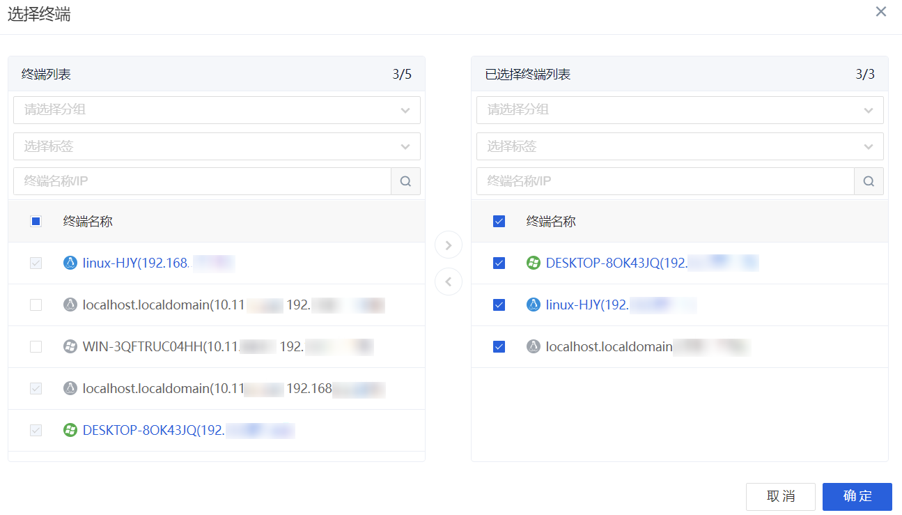 在弹出的对话框中选择需要绑定的终端(将终端列表中的终端移动至已选择端列表),单击“确定”,即可将终端绑定至本策略。
