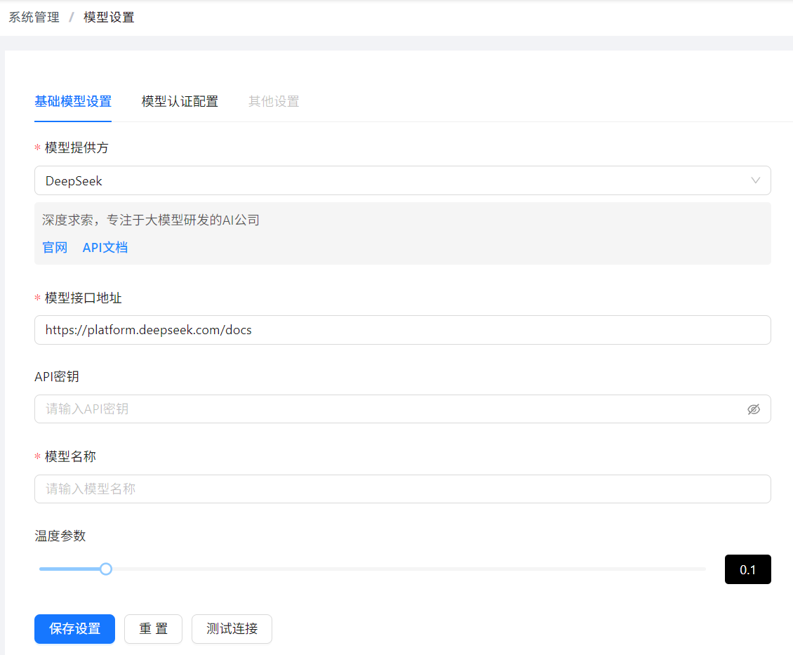 参数 说明 模型提供方 支持DeepSeek、Kimi、通义千问、OpenAI。 模型接口地址 根据实际情况进行填写。例如https://platform.deepseek.com。 API密钥 根据实际情况进行填写。没有密钥可不填。 模型名称 配置模型名称。 配置完成后,单击“测试连接”,稍等几秒钟弹窗“连接测试成功”后,点击“保存设置”即可。