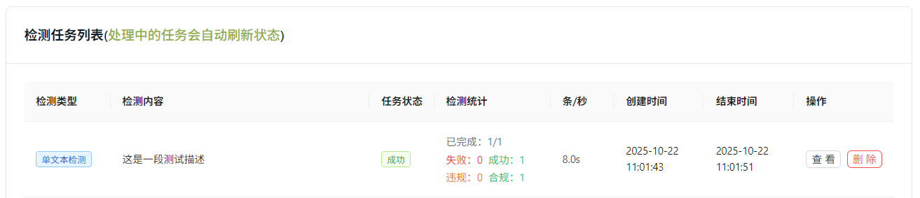 执行一次在线检测,会同步生成一个检测任务。检测的内容日志数据显示在检测任务列表中。包含字段有检测类型、检测内容、任务状态、检测统计、检测速度、创建时间、结束时间。