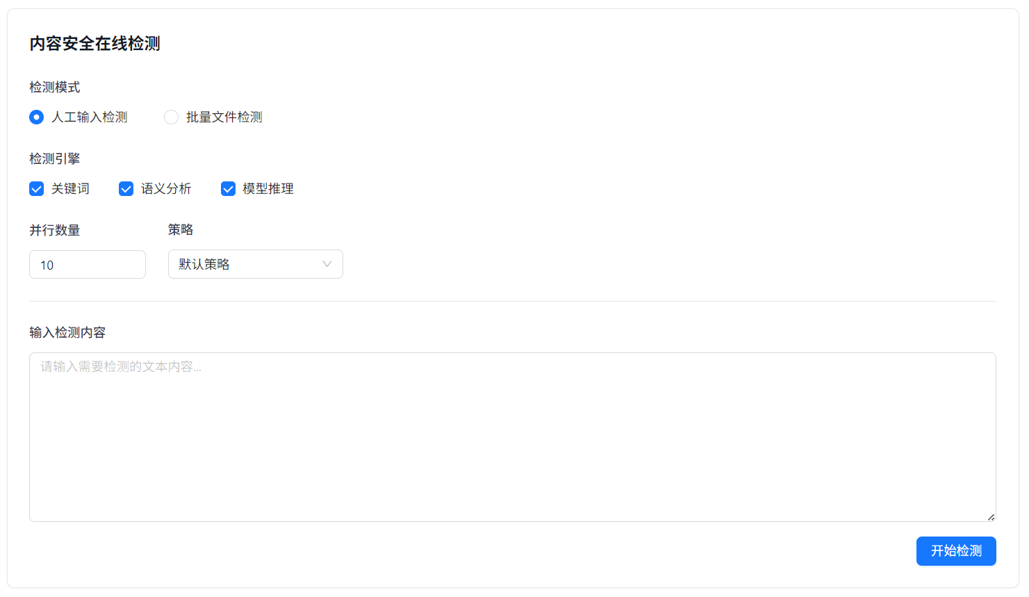 输入检测内容或上传文件 - 检测模式选择“人工输入检测”则输入检测内容。
