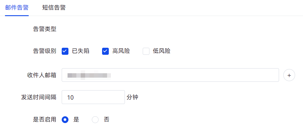 配置告警级别、收件人邮箱、发送时间间隔,是否启用选择“是”,开启邮件告警通知。