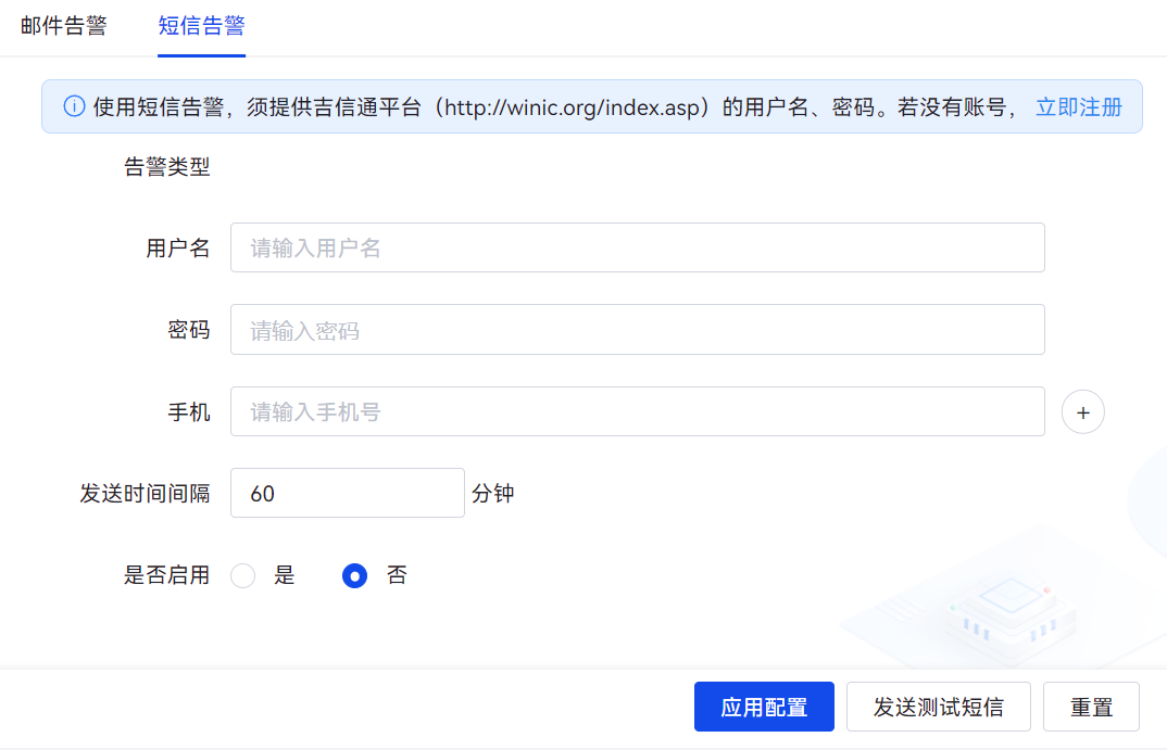 使用短信告警,须提供吉信通平台(http://winic.org/index.asp)的用户名、密码。若没有账号,请先注册。