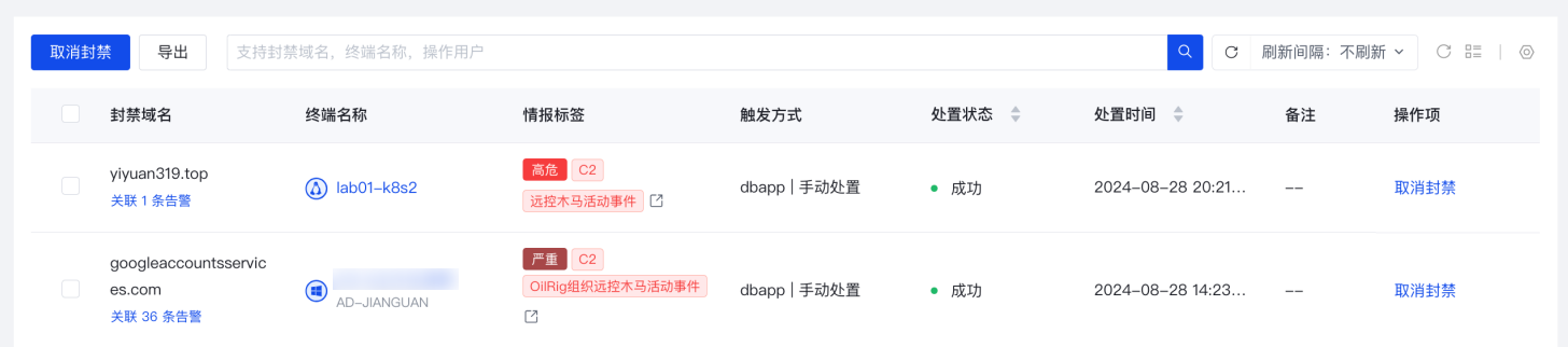 基于iptables,将特定域名列入黑名单。当用户尝试访问这些域名时,请求将被拒绝,实现恶意域名访问及回连的阻断;点击<取消封禁>可以取消当前域名的隔离。