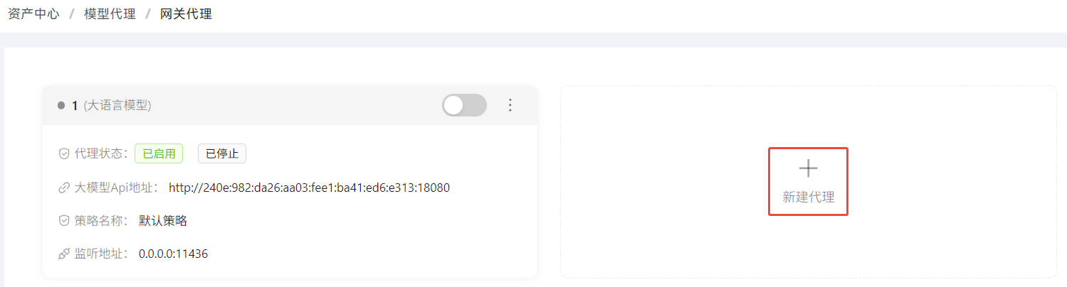在菜单栏选择“资产中心 > 模型代理 > 网关代理”,单击“新建代理”。