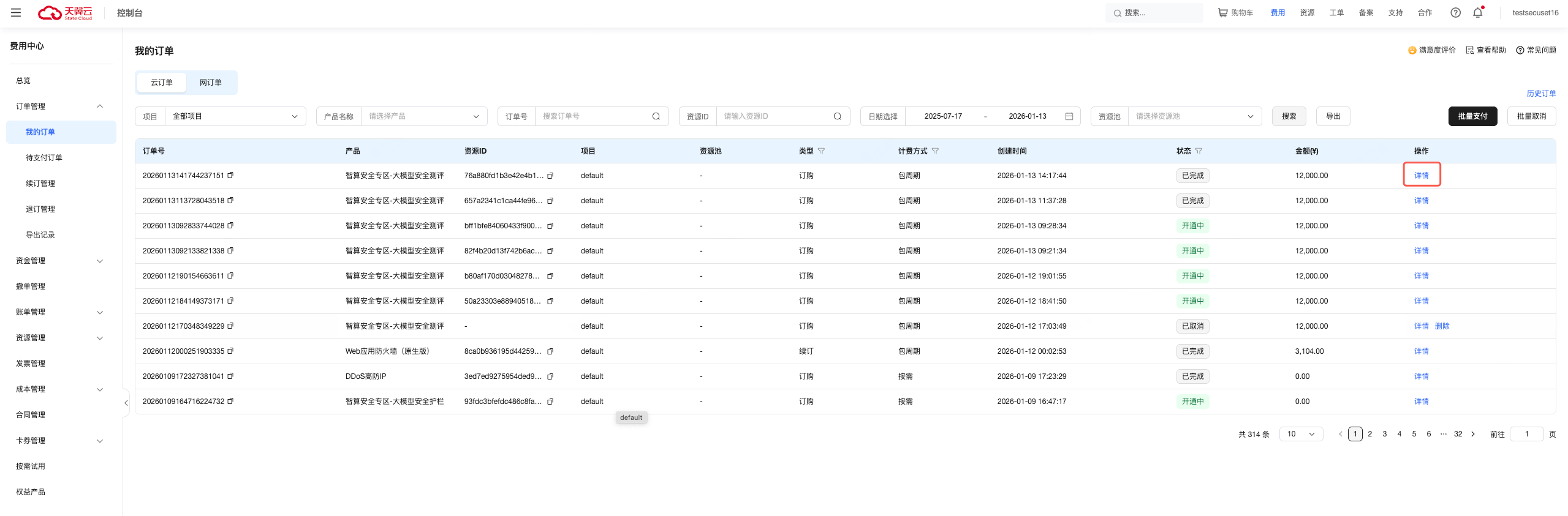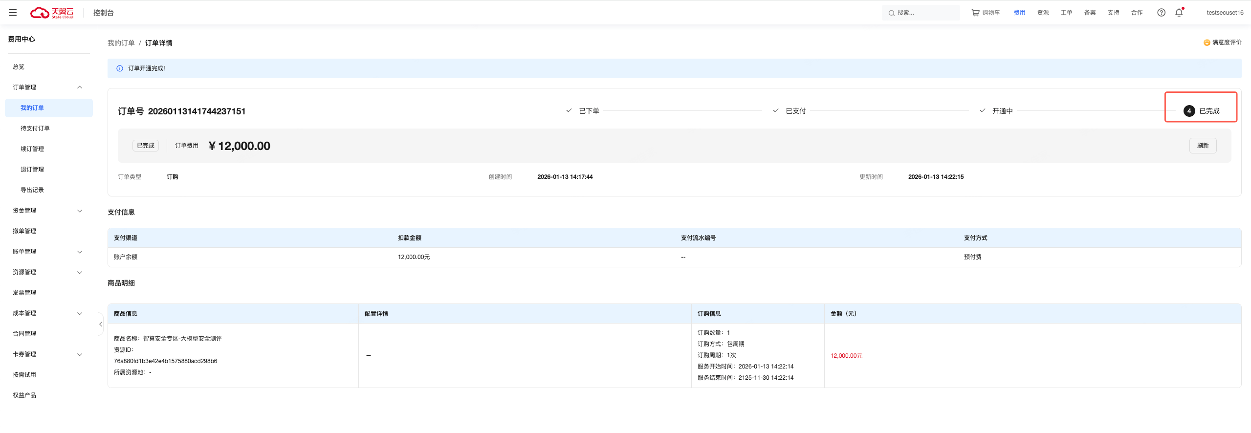 单击“详情”,待订单状态为开通完成后即可进入大模型安全测评页面。