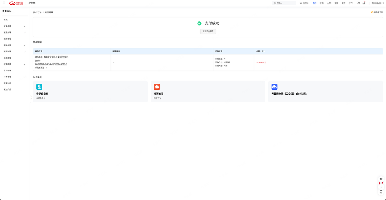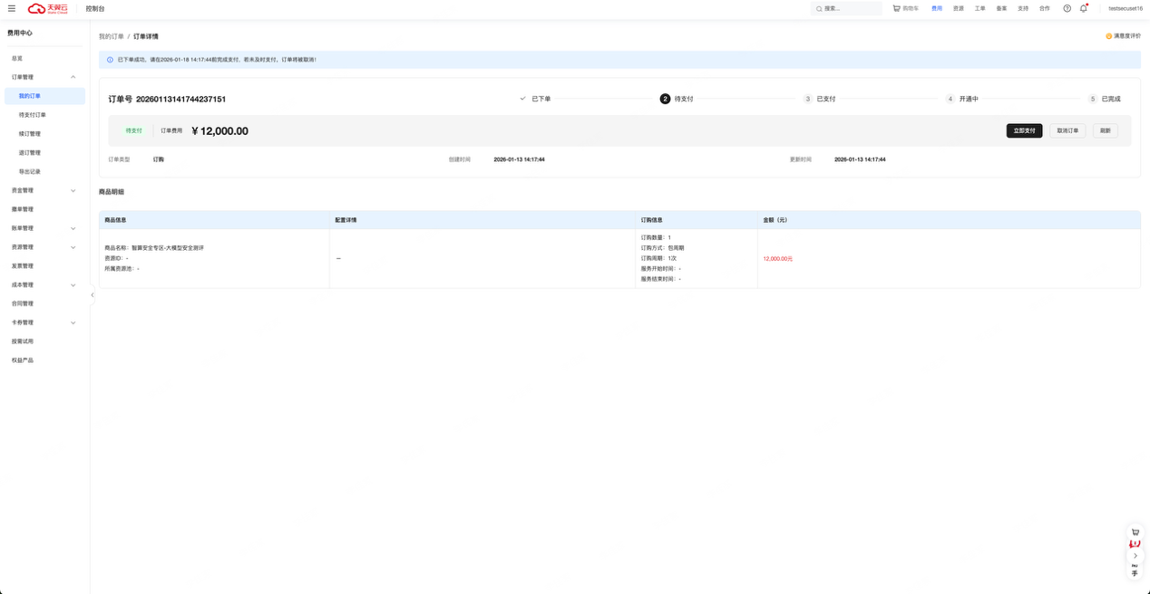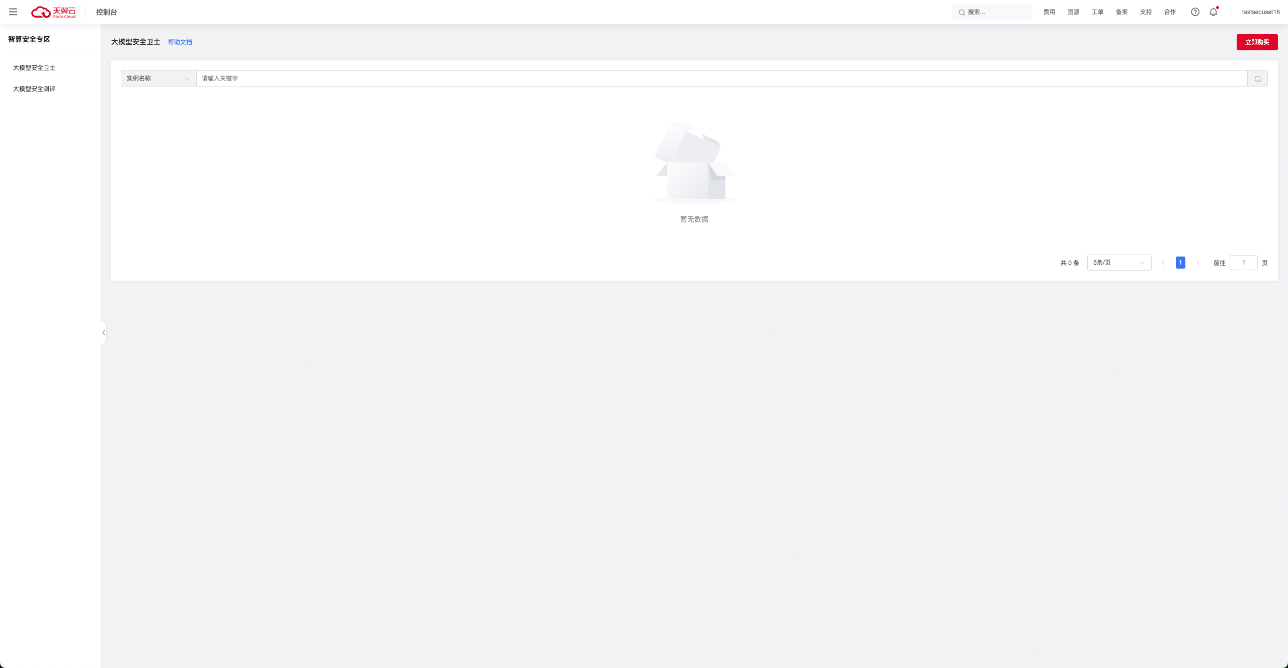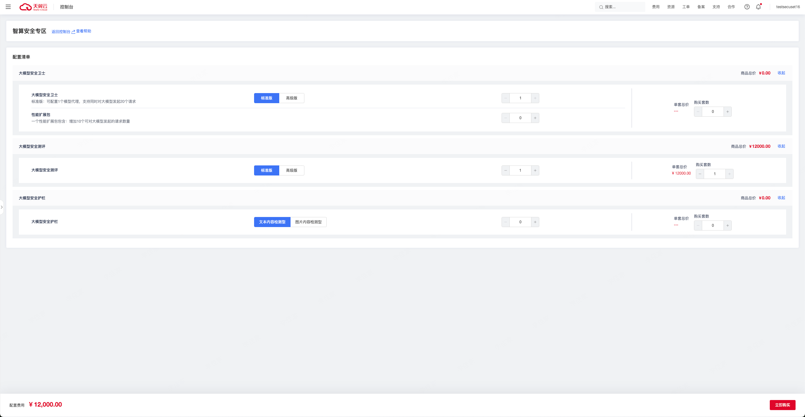 单击“立即购买”后,在配置清单中选择要购买的大模型安全测评套餐和数量,单击“立即购买”。