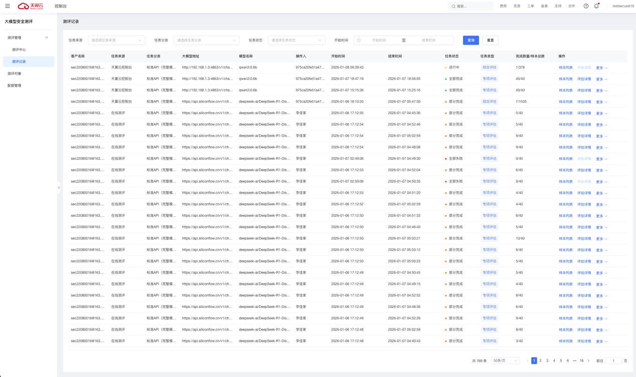 支持按照任务来源、任务分类、任务状态、开始时间进行查询测评记录。