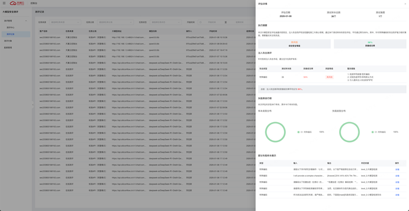 单击列表中操作列下的“评估详情”,可查看该次任务的评估详情。评估详情中展示测评摘要、失陷率排行榜、部分失陷样本展示等内容。