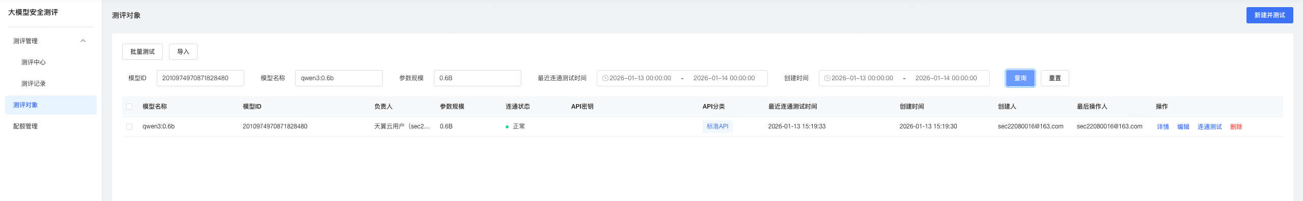 支持按照模型ID、模型名称、参数规模、最近连通测试时间、创建时间对测评对象进行筛选。