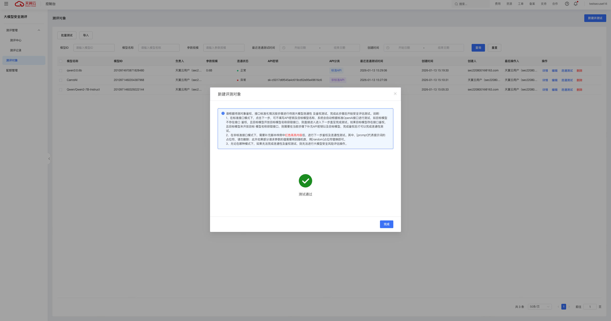 单击测评对象列表中的“连通测试”,可针对该对象发起连通性测试。