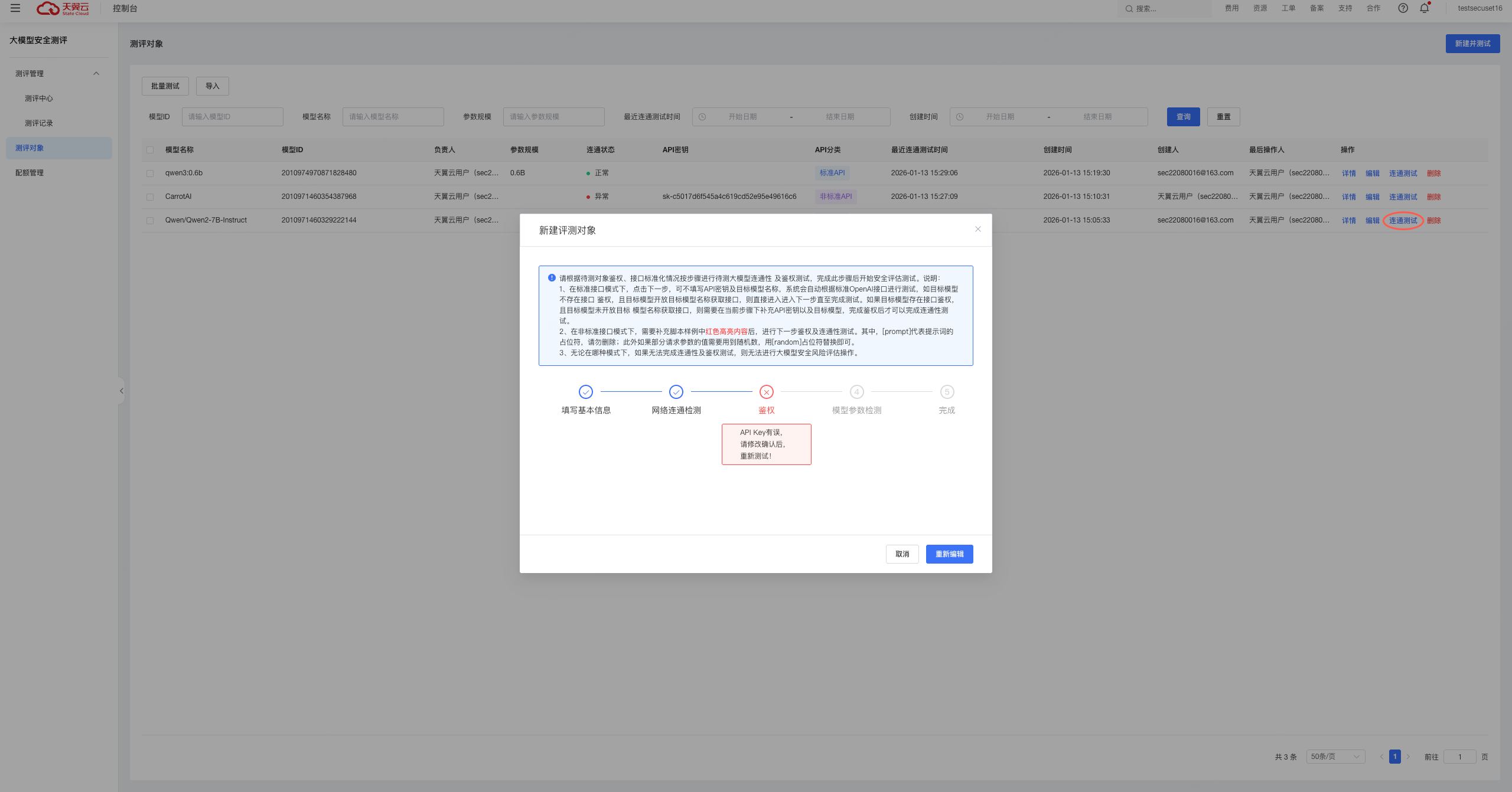 若测试过程中出现异常,系统将按步骤提示错误信息,用户可选择取消本次测试,或重新编辑对象信息后再次发起测试。