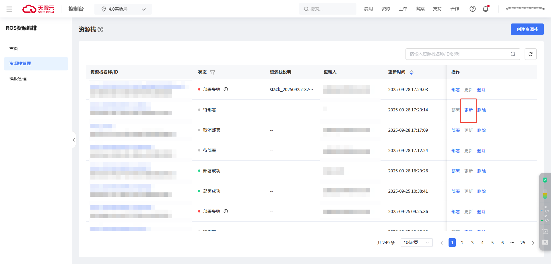 在资源栈列表中直接单击更新,或在资源栈详情中单击更新。