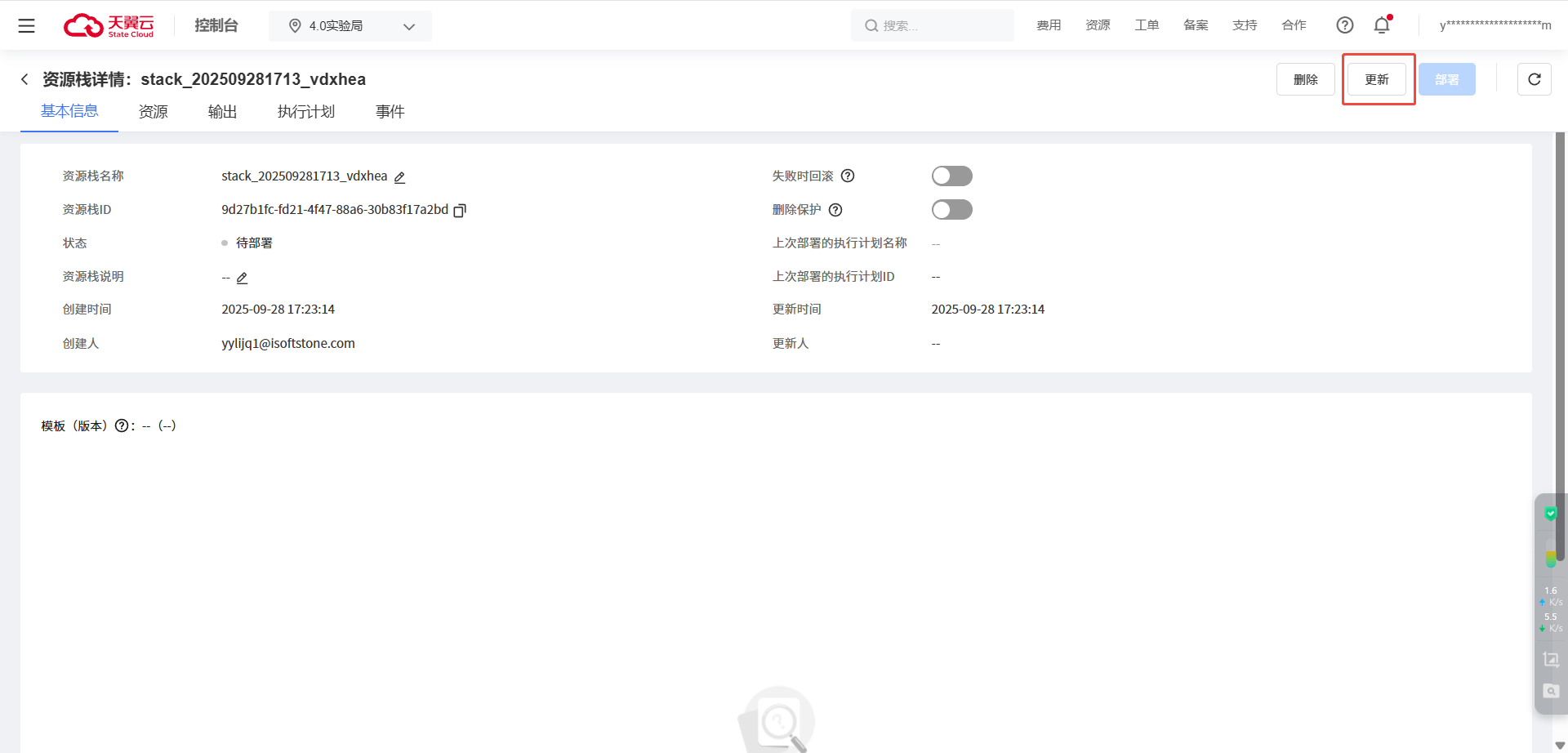 资源栈拥有可部署的执行计划时,不可更新资源栈,请先部署执行计划或删除待部署的执行计划后,再更新资源栈。