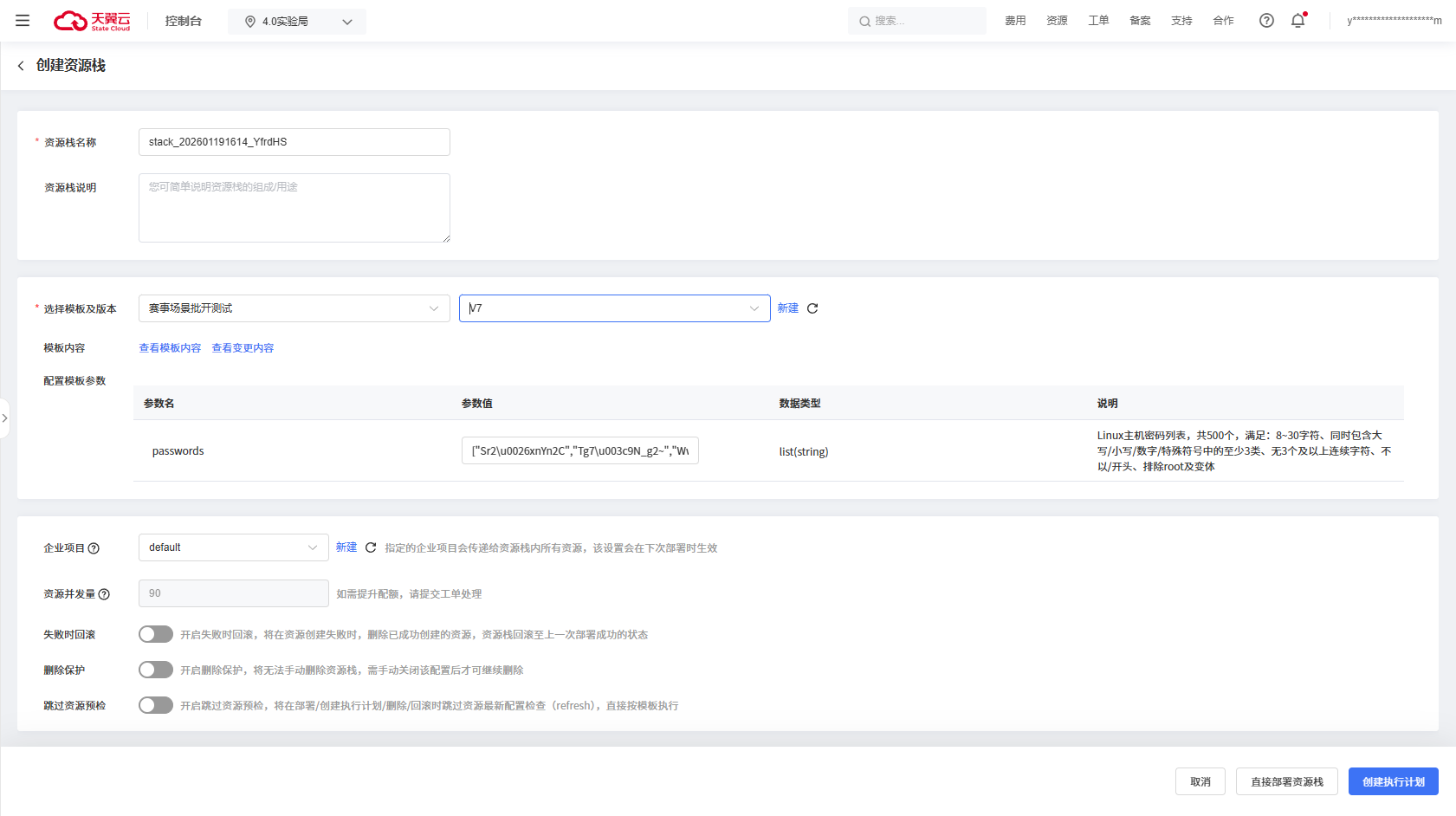 执行计划说明 | 否 | 可简要说明资源栈的更新内容,最长可输入255字符 | 批量创建5台云主机 |