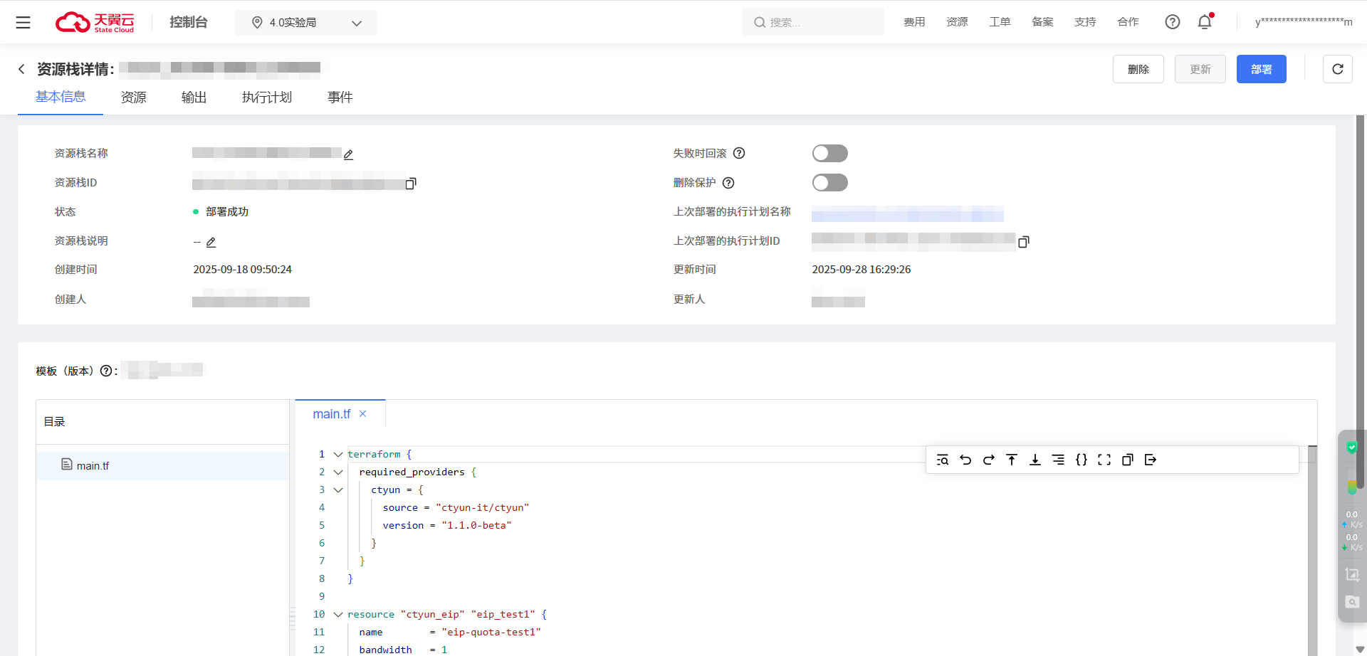 展示资源栈基本信息,展示当前资源栈的模板及版本信息,展示最近一次部署成功的执行计划信息