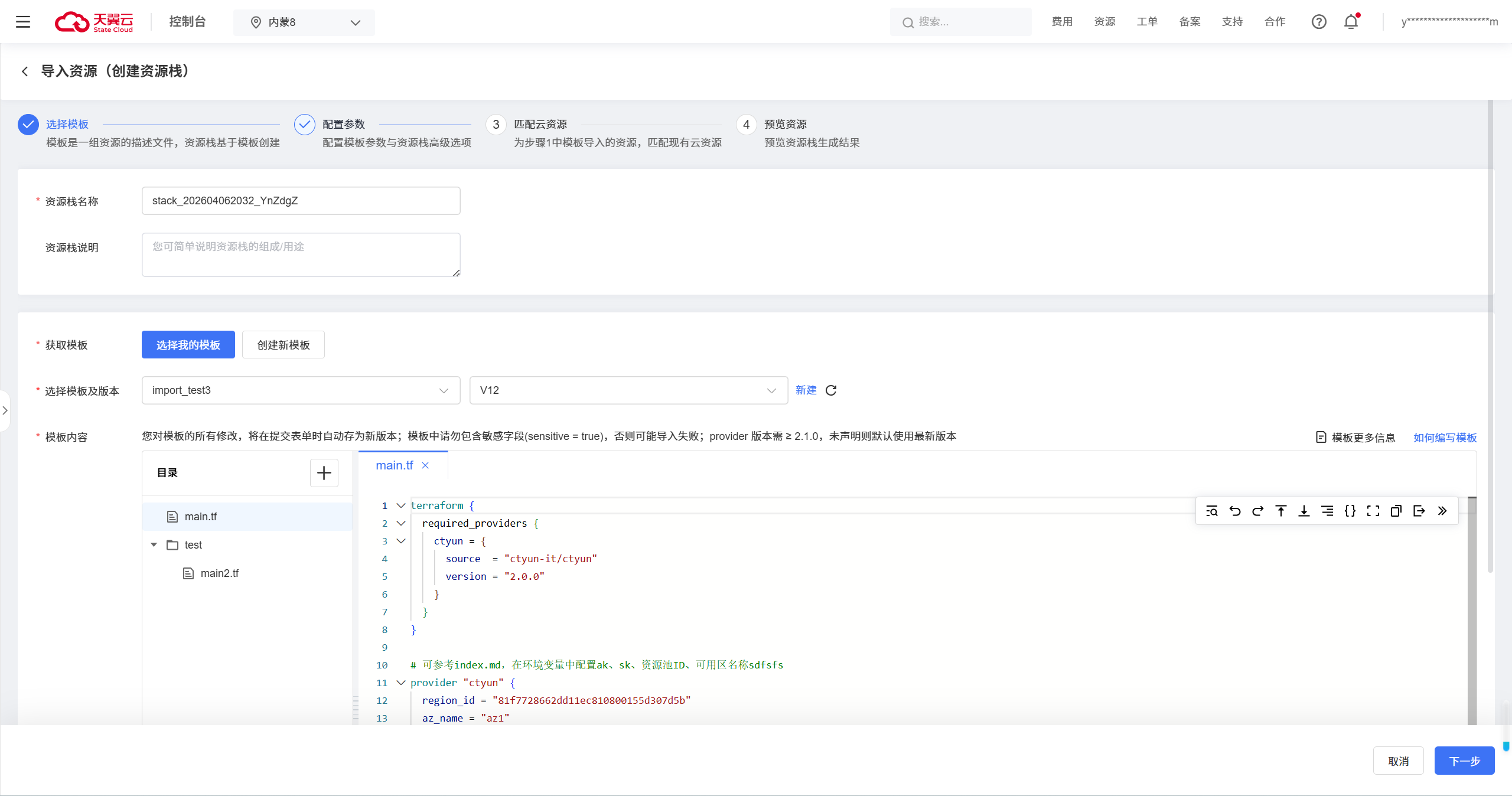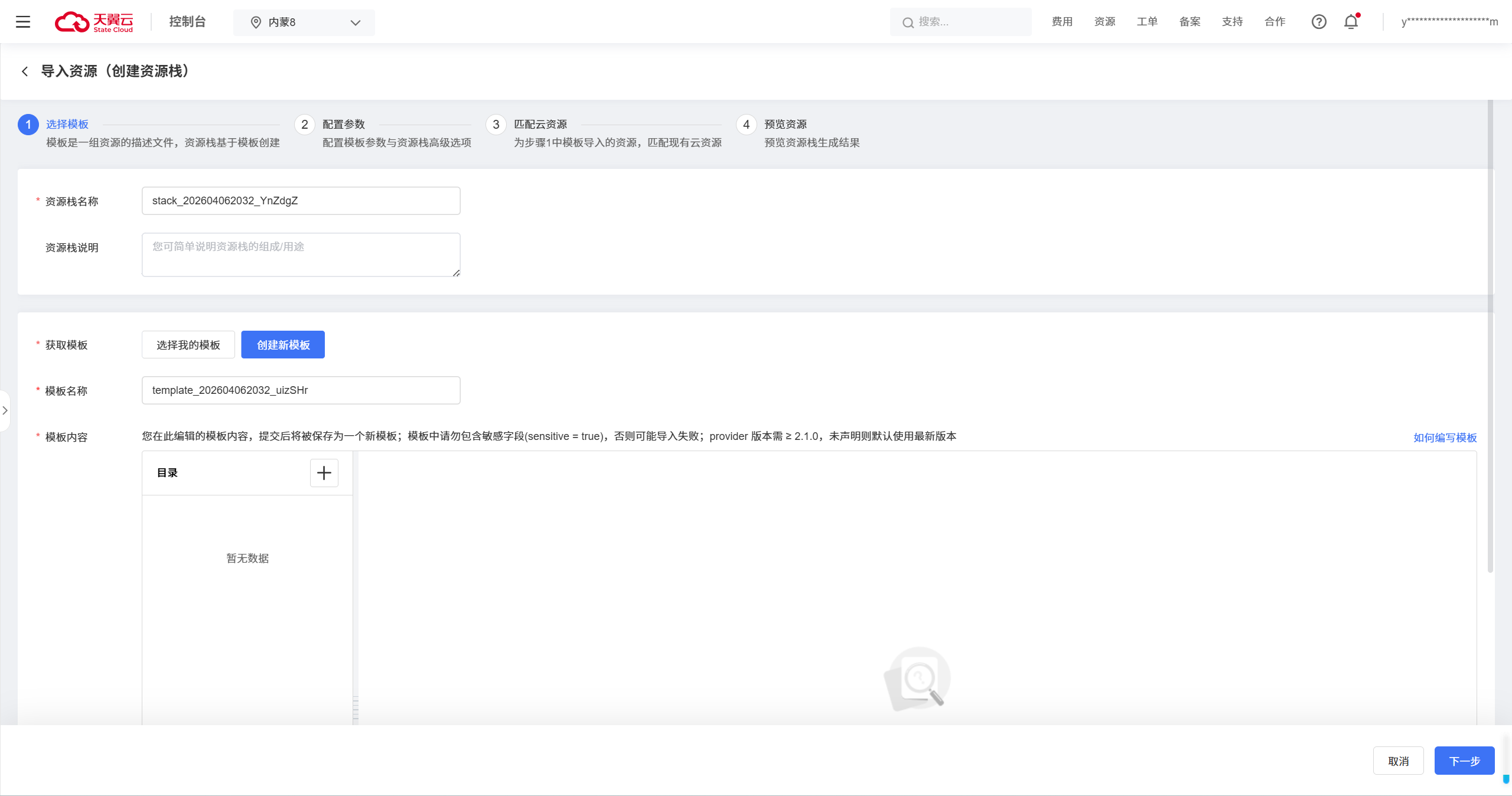 模板是一组资源的描述文件,资源栈基于模板创建。您可在完成基础信息配置后,选择目标导入模板或创建一个新模板,作为导入资源的“指导说明”,平台将依据模板内容为您导入资源至新资源栈。