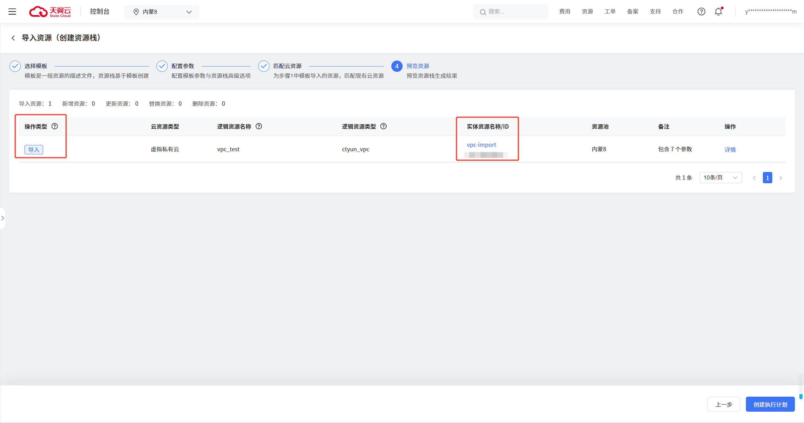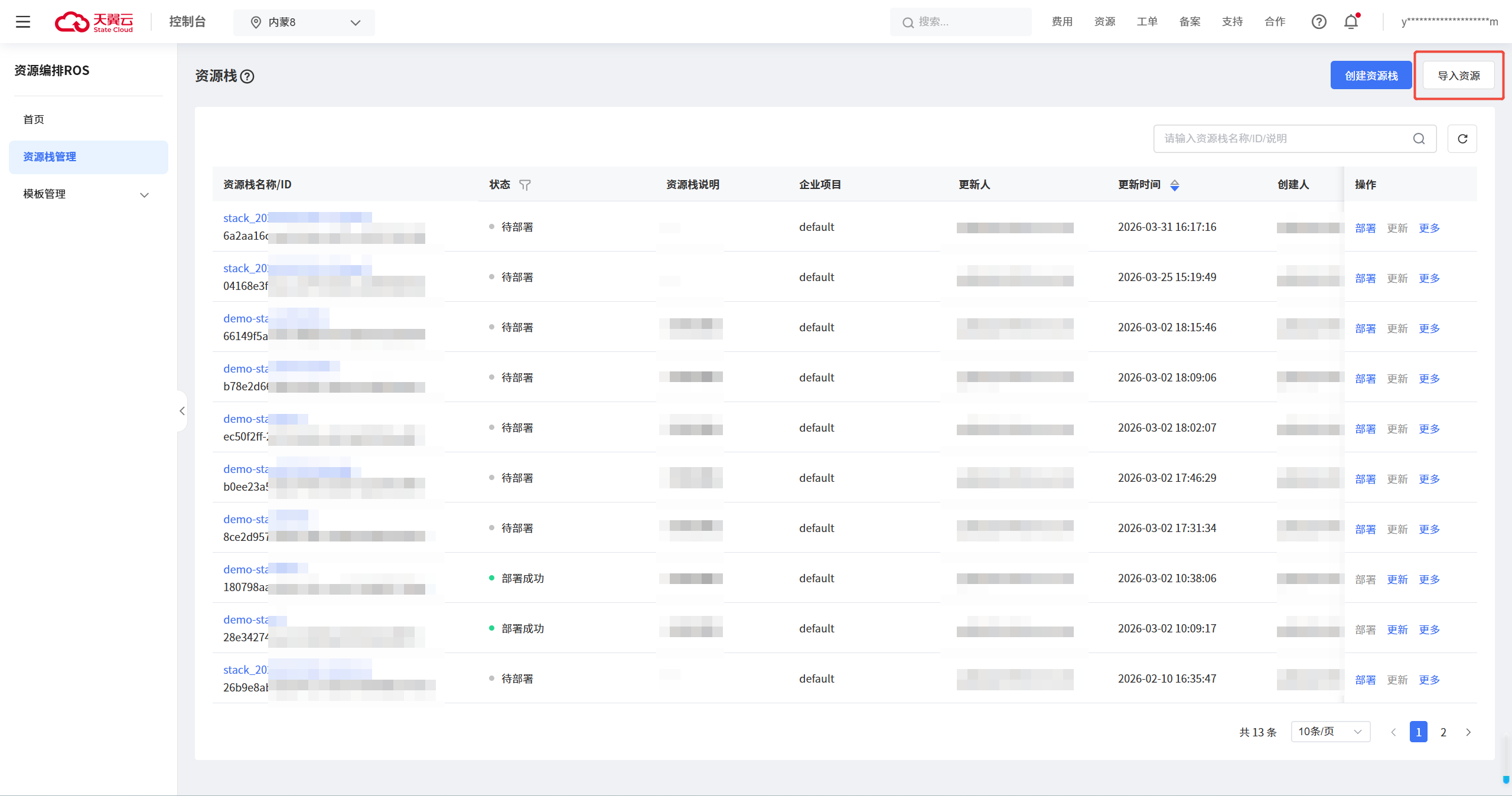 1. 导入资源仅限当前资源池,请选择本资源池下的资源。若选择其他资源池的资源,将因无法匹配而被判定为新增、更新或删除一个资源,进而导致导入失败(导入的同时不支持同时新增、更新或删除资源)。