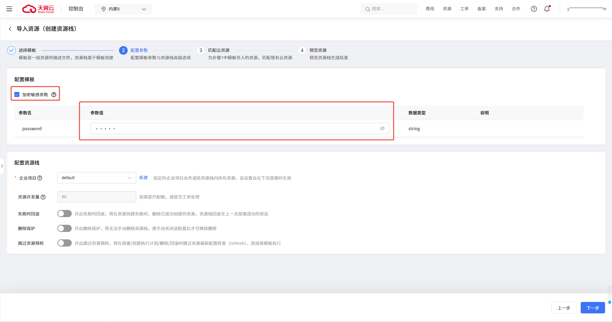 | 失败时回滚 | 否 | 默认不开启。开启失败时回滚,将在资源创建失败时,删除已成功创建的资源,资源栈回滚至上一次部署成功的状态。 | 不开启 |