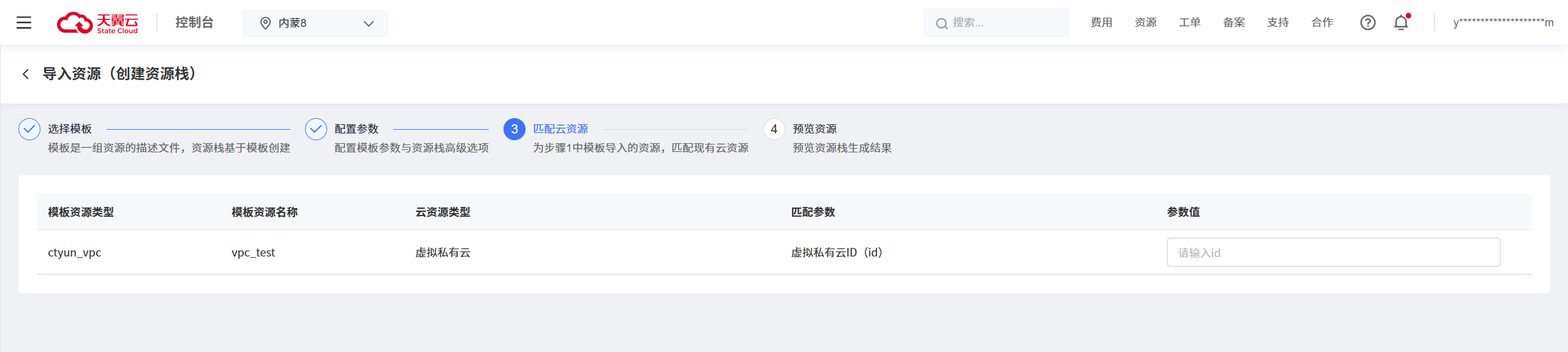 请为步骤1中选择/创建的模板中声明的导入资源,匹配一个现有云资源。如下图所示,您在模板中声明了一个名为 vpc_test 的虚拟私有云资源,则请填入该资源对应的实体资源的id为vpc-igrird8kxn。