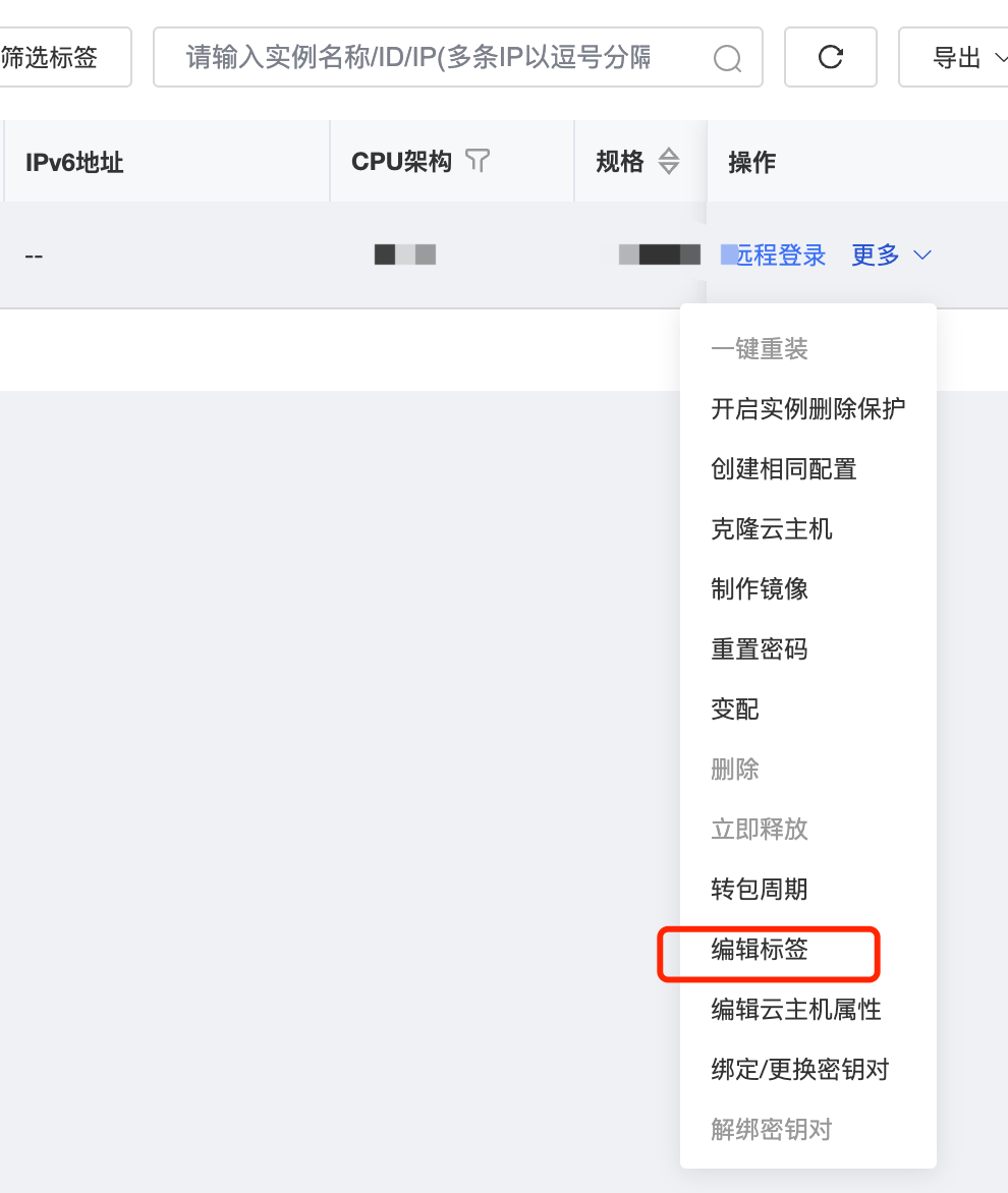 3、或在创建完资源后,在资源清单列表,点击操作栏的“编辑标签”完成标签绑定。