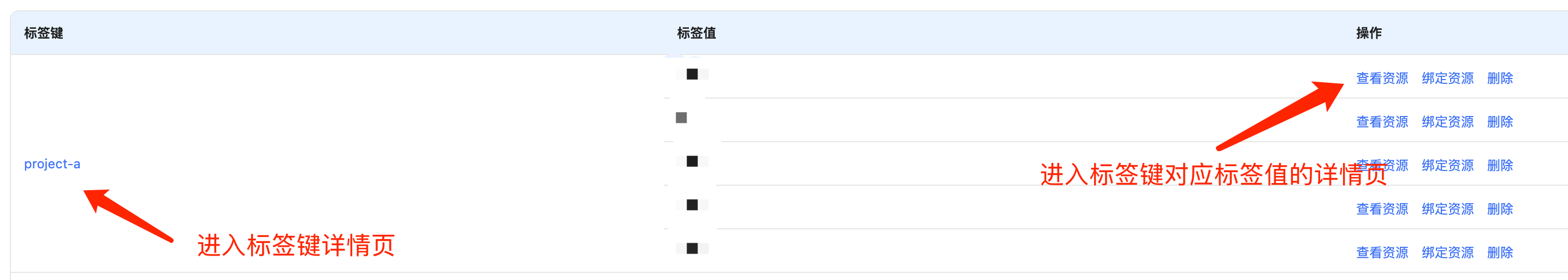 2、进入标签详情页:标签键详情页可查看标签键下所有标签值绑定的云资源,标签键值详情页可查看标签值所绑定的云资源。