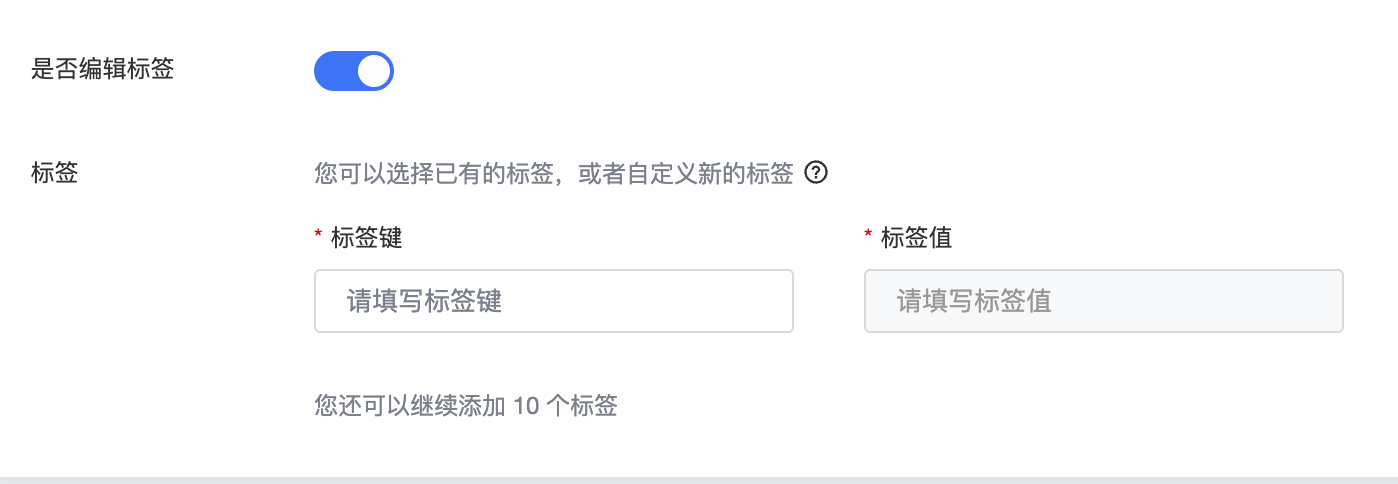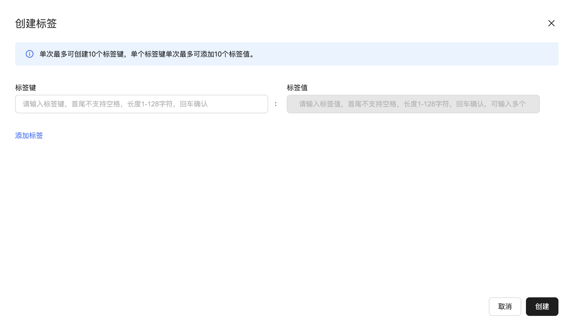 3、页面创建标签单次最多可创建10个标签,单个标签键单次最多可添加10个标签值。