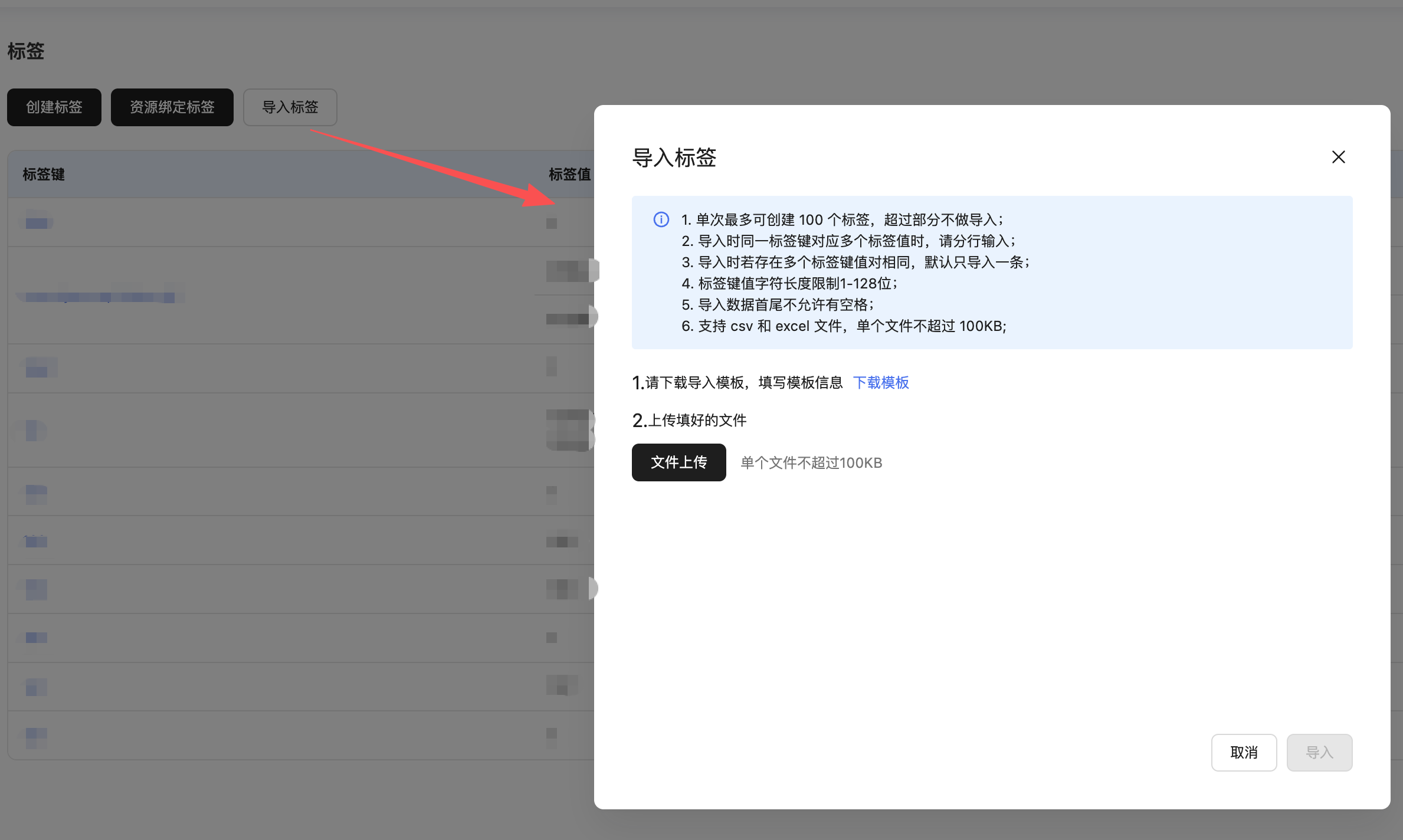 5、导入标签仅支持csv和excel文件,单个文件不超过100KB。