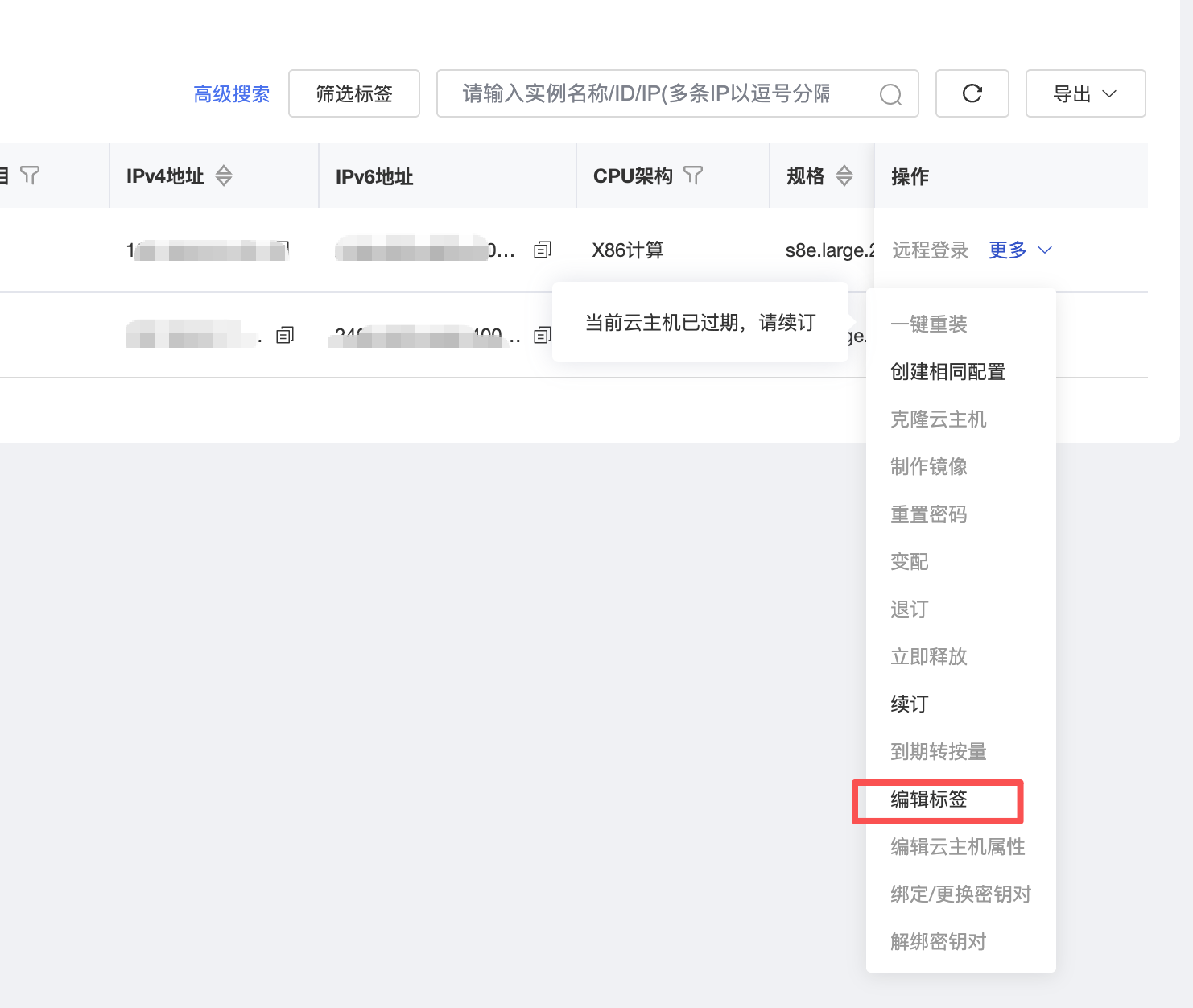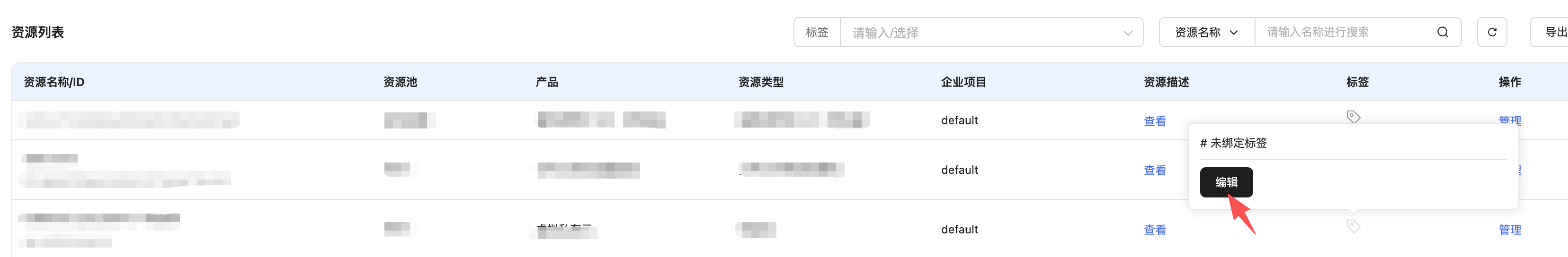2、在资源清单列表,点击操作栏的“编辑标签”。