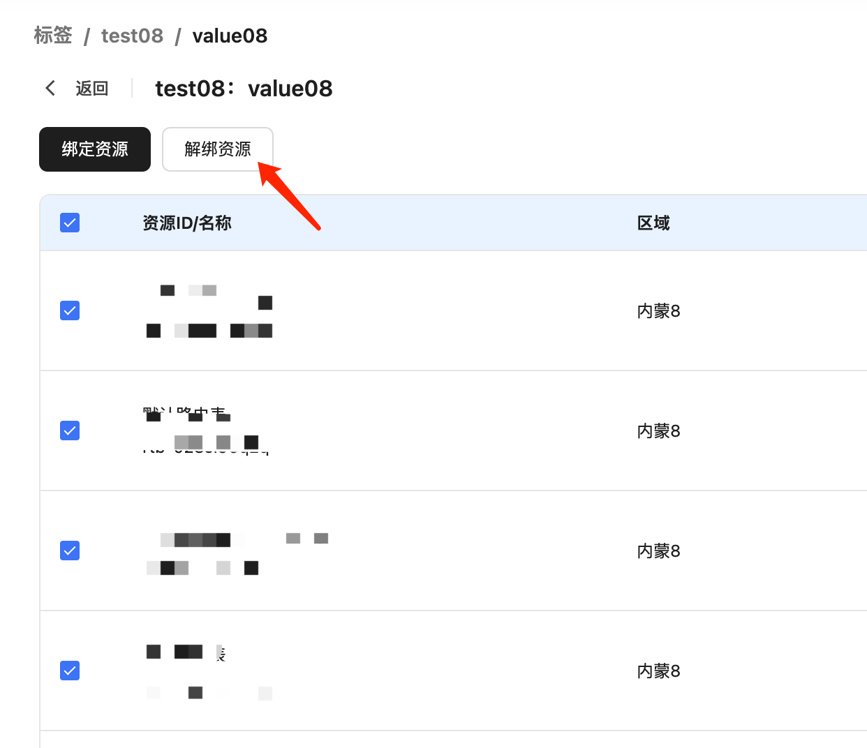 2、进入标签键值详情页,选择要解绑的资源后,点击“解绑资源”。