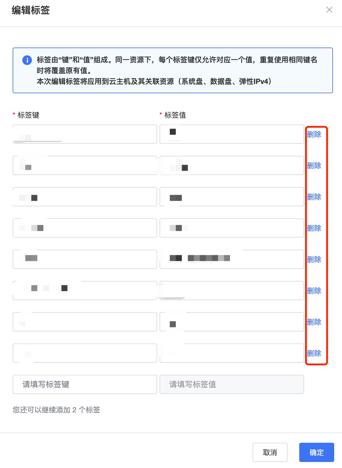 3、进入编辑页后,删除需要解绑的标签键值对,点击“确定”。