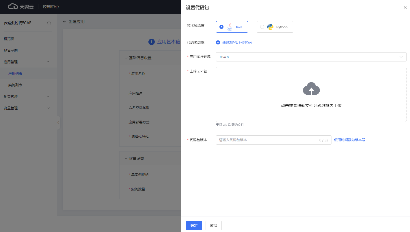 在弹出的设置代码包窗口,选择应用所属的技术栈语言以及应用所需的运行环境