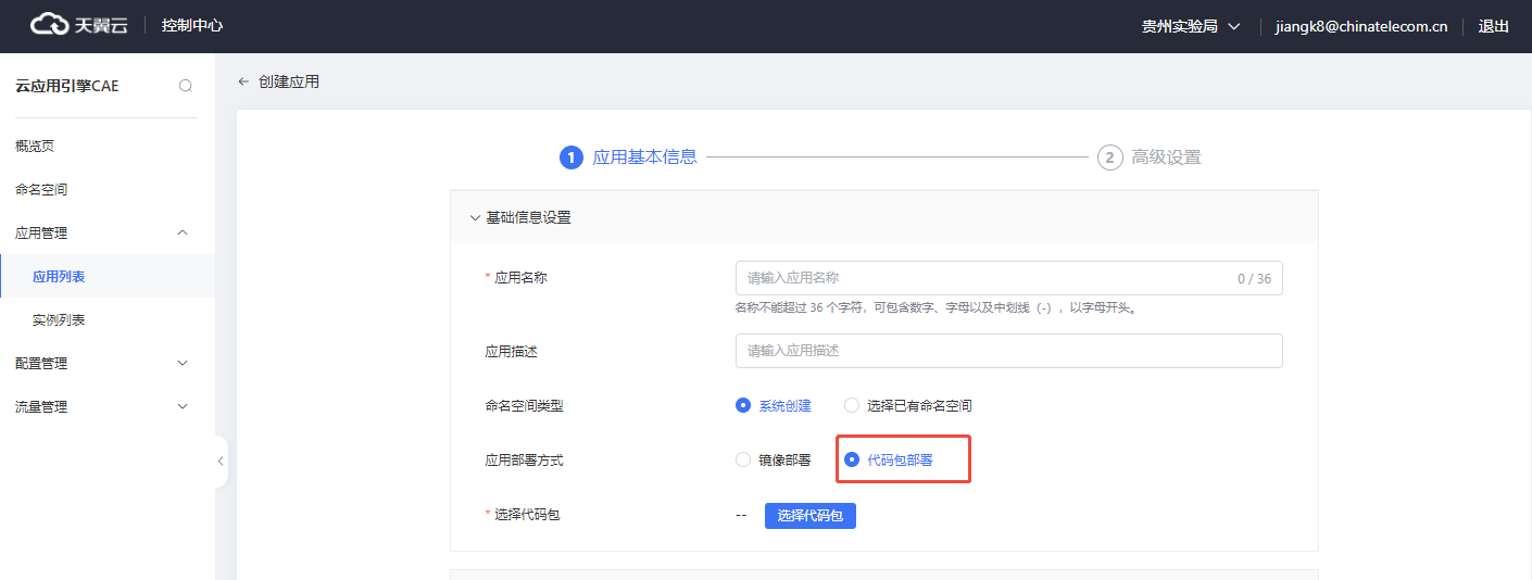 在应用创建基础信息页中,应用部署方式选择代码包部署,点击设置镜像