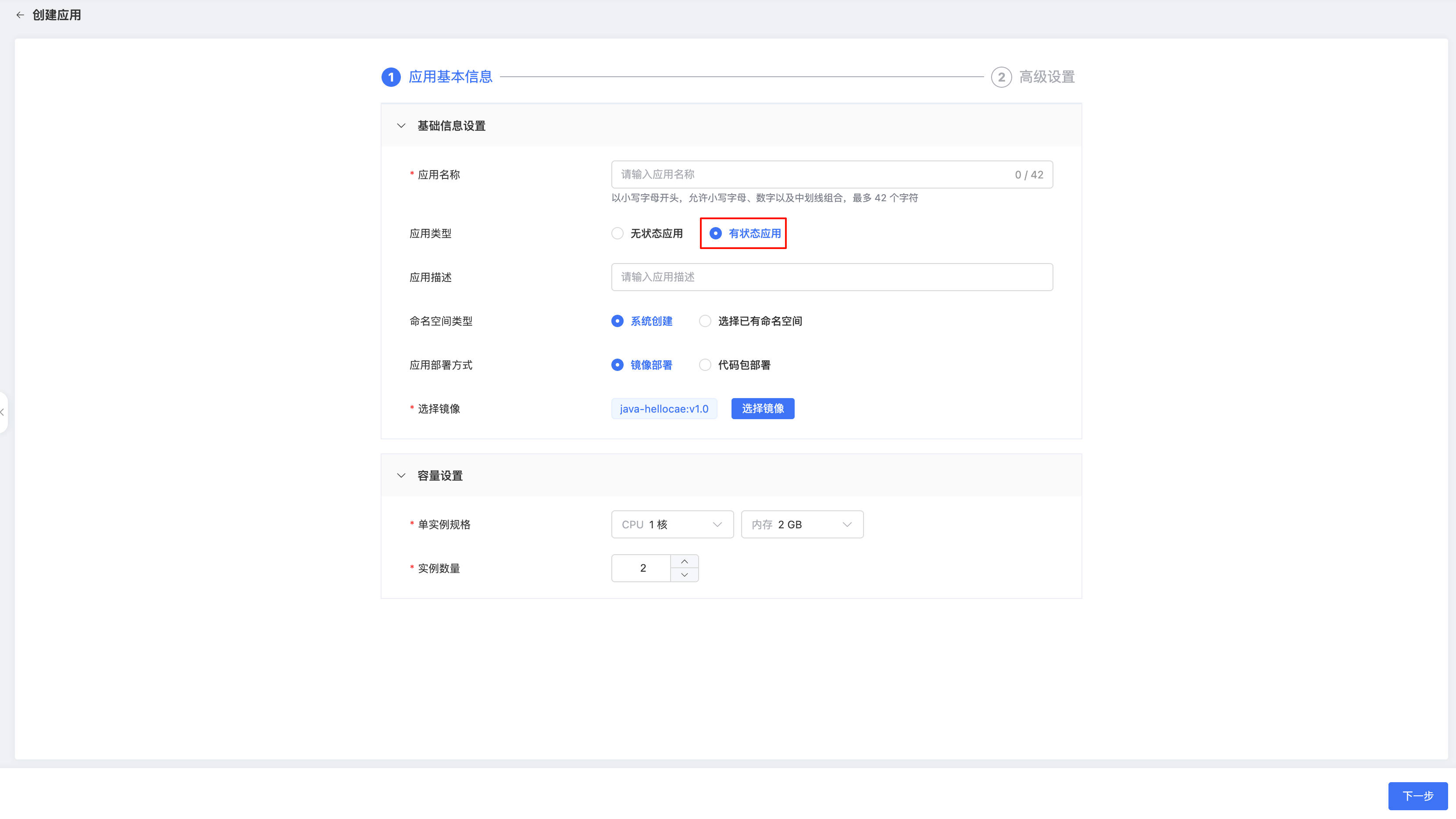 创建有状态应用与创建无状态应用的操作基本一致,只需在应用基本信息页面中,应用类型选择有状态应用。