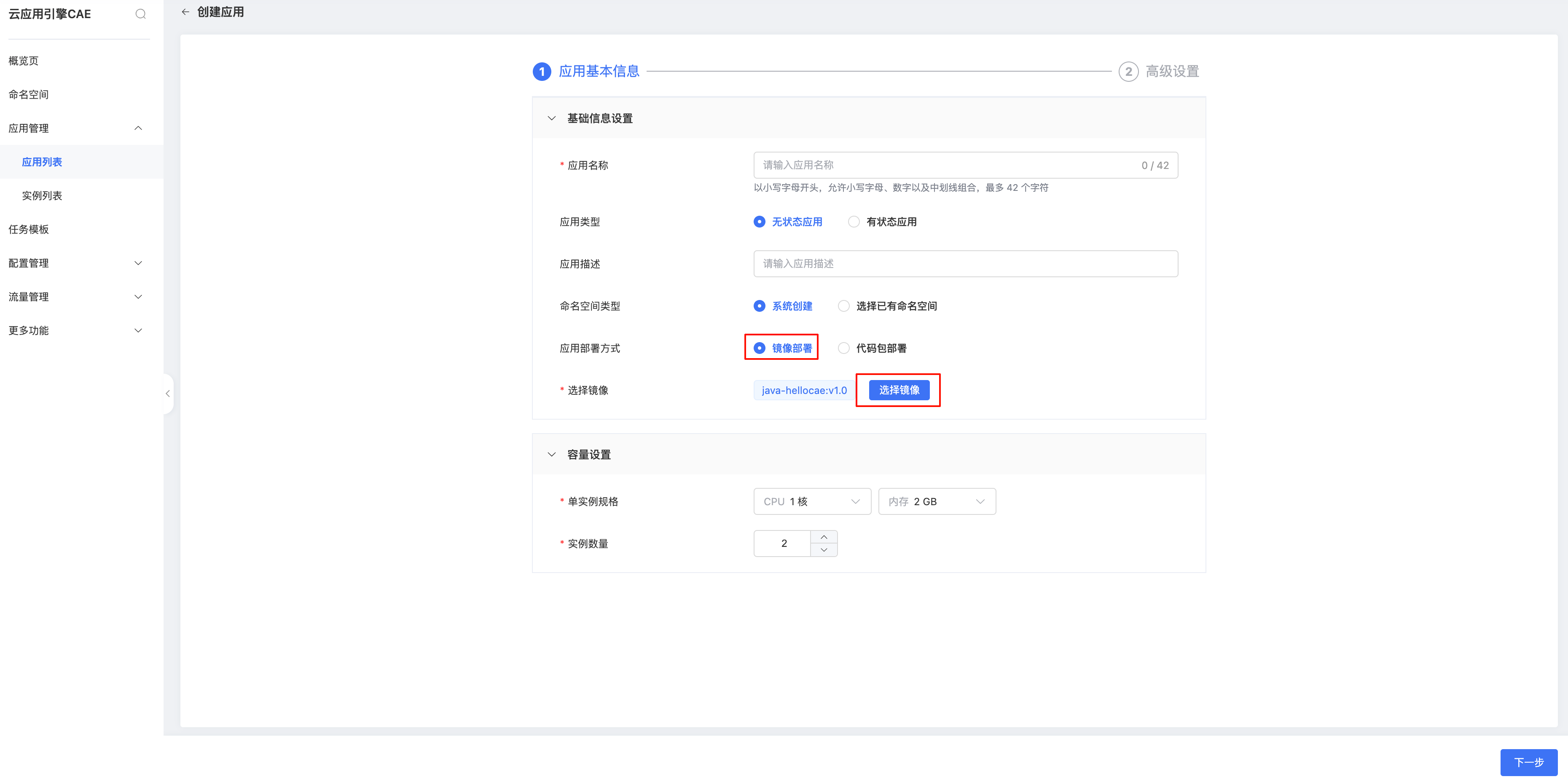 在应用基础信息页面中,应用部署方式选择镜像部署,点击设置镜像。