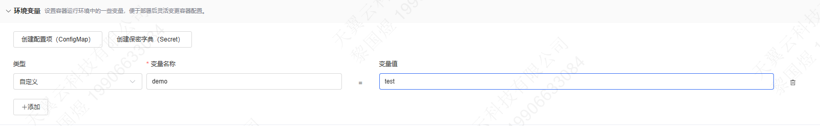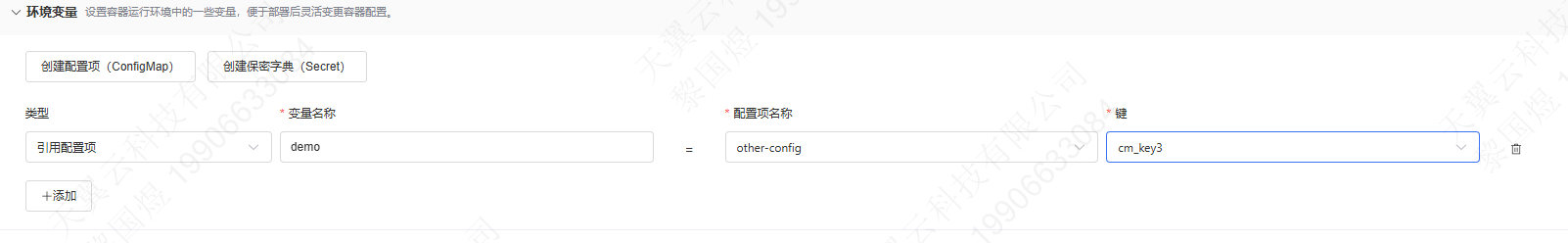 从类型下拉列表,选择引用配置项,输入变量名称,并在配置项名称、键下拉框中选择已创建的配置项名称和该配置项中的键。支持配置单个键或者全部键。