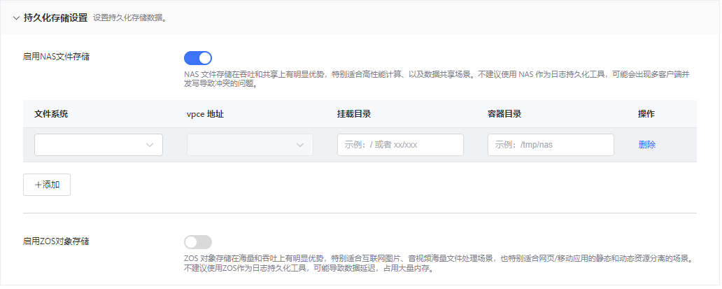 找到并展开持久化存储区域,配置相关参数。打开启用NAS文件存储的开关。在NAS文件系统所在行的下拉列表,选择待挂载的NAS,并设置挂载源、挂载目录、容器路径、权限和挂载参数。