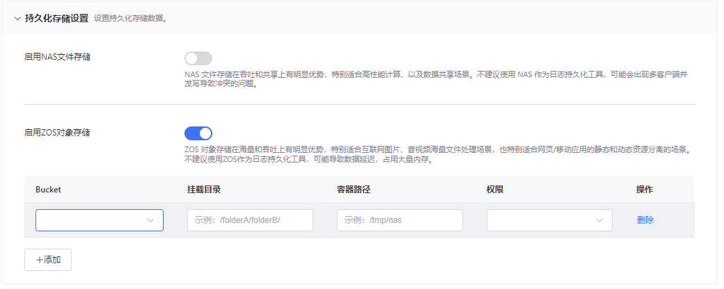 展开持久化存储设置区域,启用OSS对象存储。配置Bucket、挂载目录、容器路径以及读写权限等相关信息。如需添加多条信息,请点击添加。