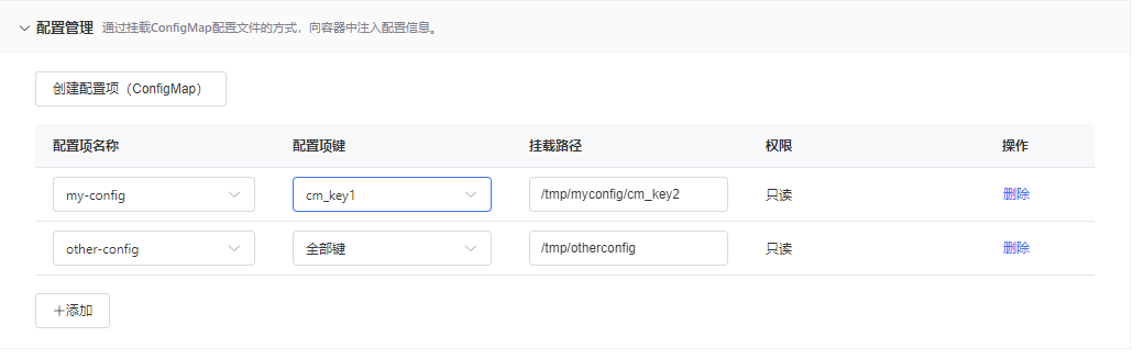 展开配置管理区域,单击+添加按钮,您可以将特定配置项(ConfigMap)的单个键或全部键注入容器,以将其转换为容器中的文件。配置项的值将作为文件的内容,您可以自定义文件的挂载路径。