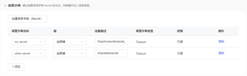展开保密字典区域,单击+添加按钮,您可以将特定保密字典(Secret)的单个键或全部键注入容器,以将其转换为容器中的文件。保密字典项的值将作为文件的内容,您可以自定义文件的挂载路径。