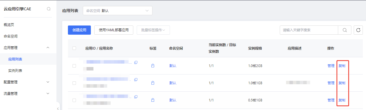 如果您希望将当前应用的配置完全复制到其他命名空间,您可以在应用引擎控制台使用应用复制功能。