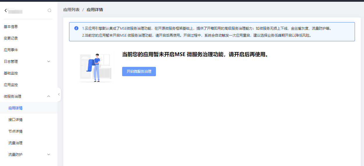 如果是应用运行过程中开启微服务治理,会引起应用容器重启,请您在业务低峰期时进行操作
