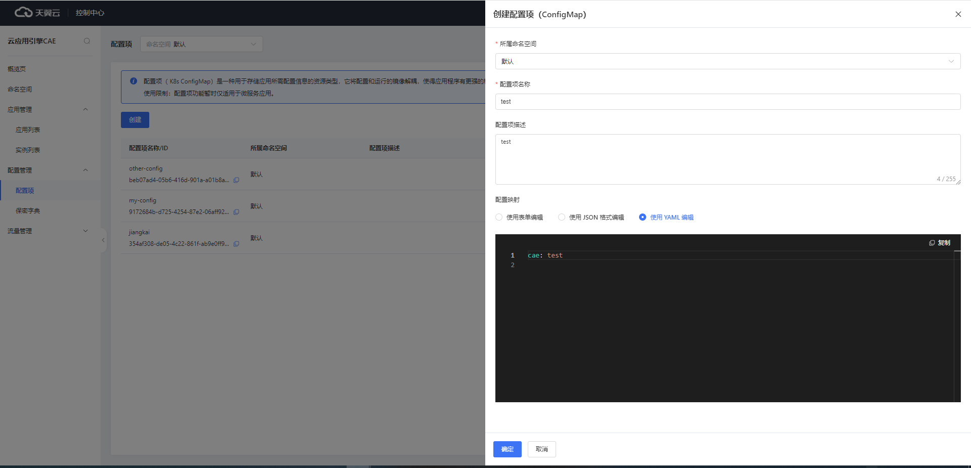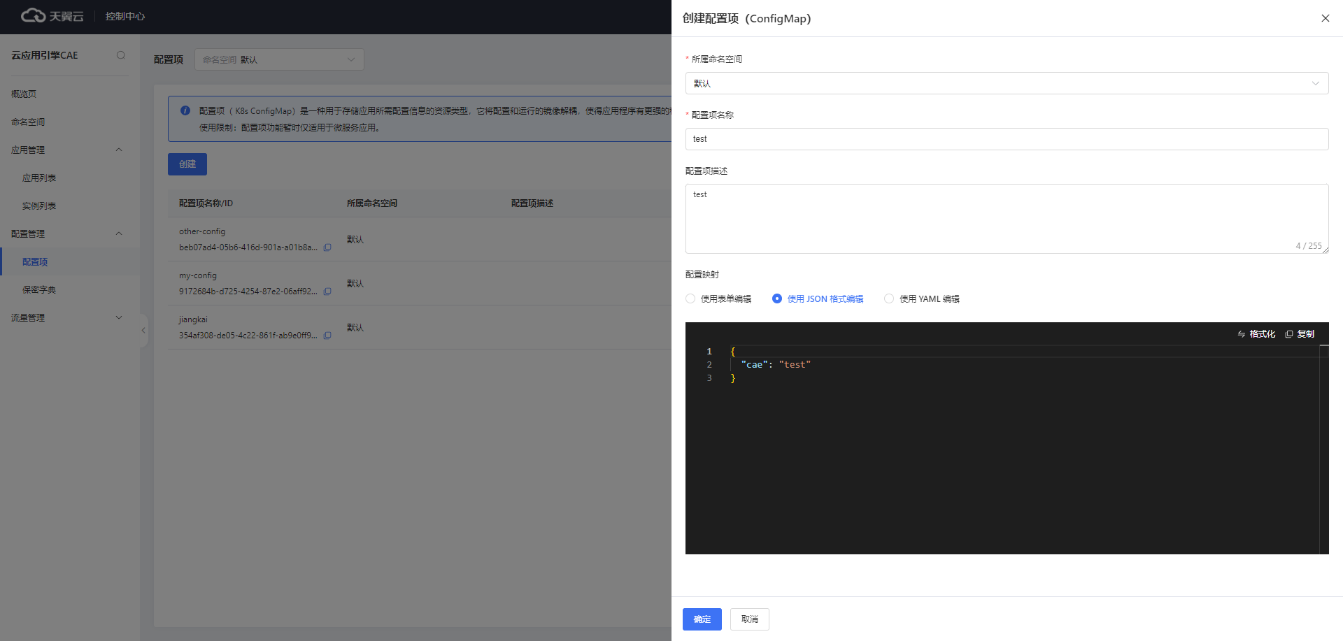 | 配置项描述 | 对配置项的文字说明,便于识别和管理 | 这是一个测试 ConfigMap |