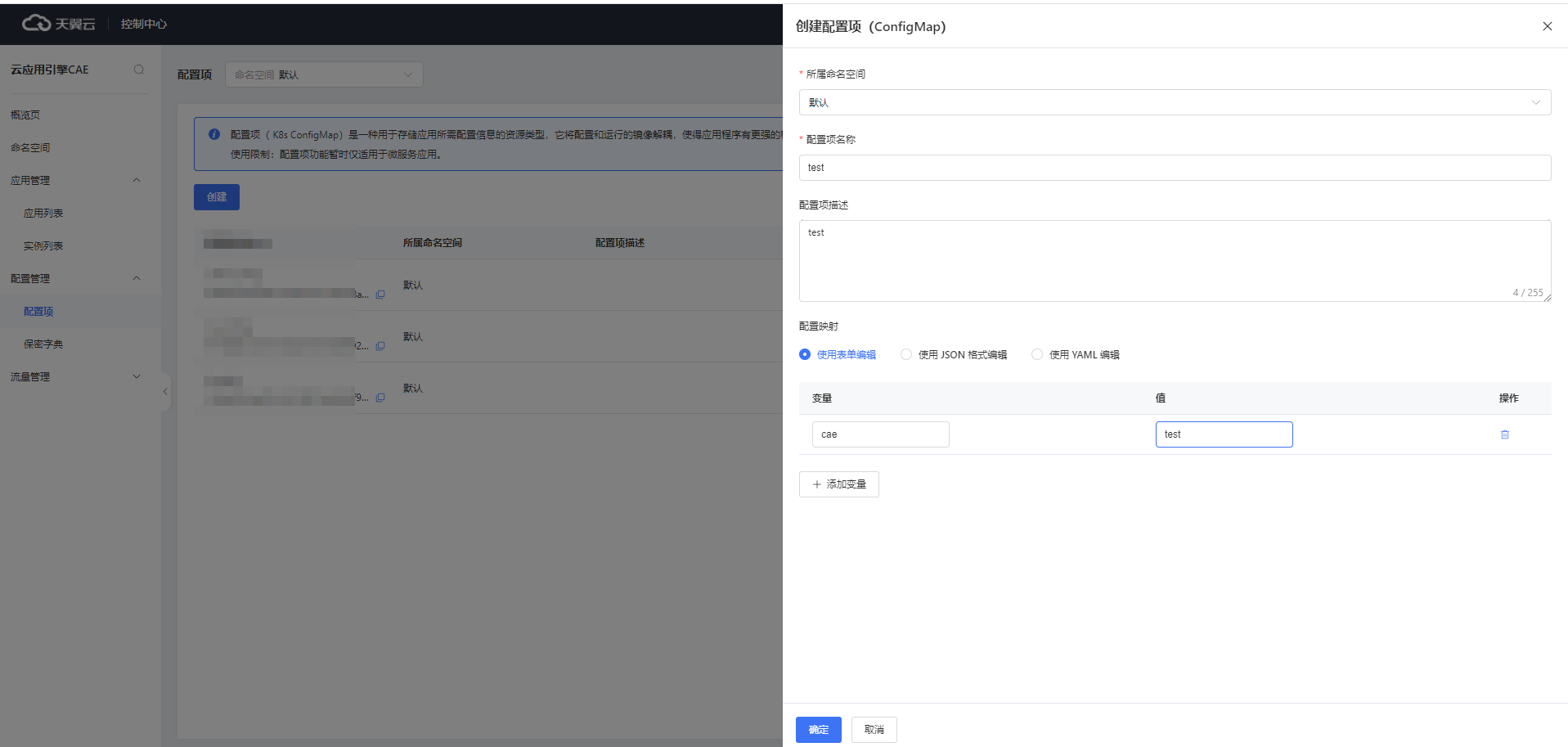 | 配置映射 | 单击“使用表单添加变量”,在对话框中输入变量名和变量值 | 变量名:env 变量值:test |