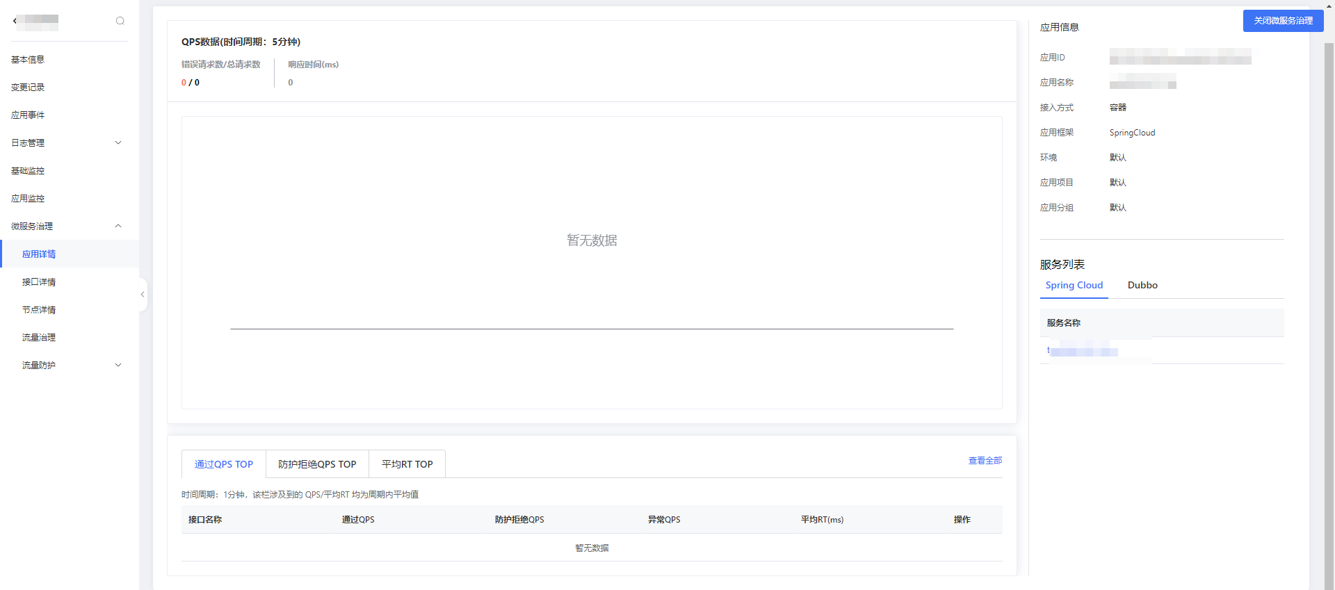 应用基础信息页面,选择 微服务治理 > 应用详情