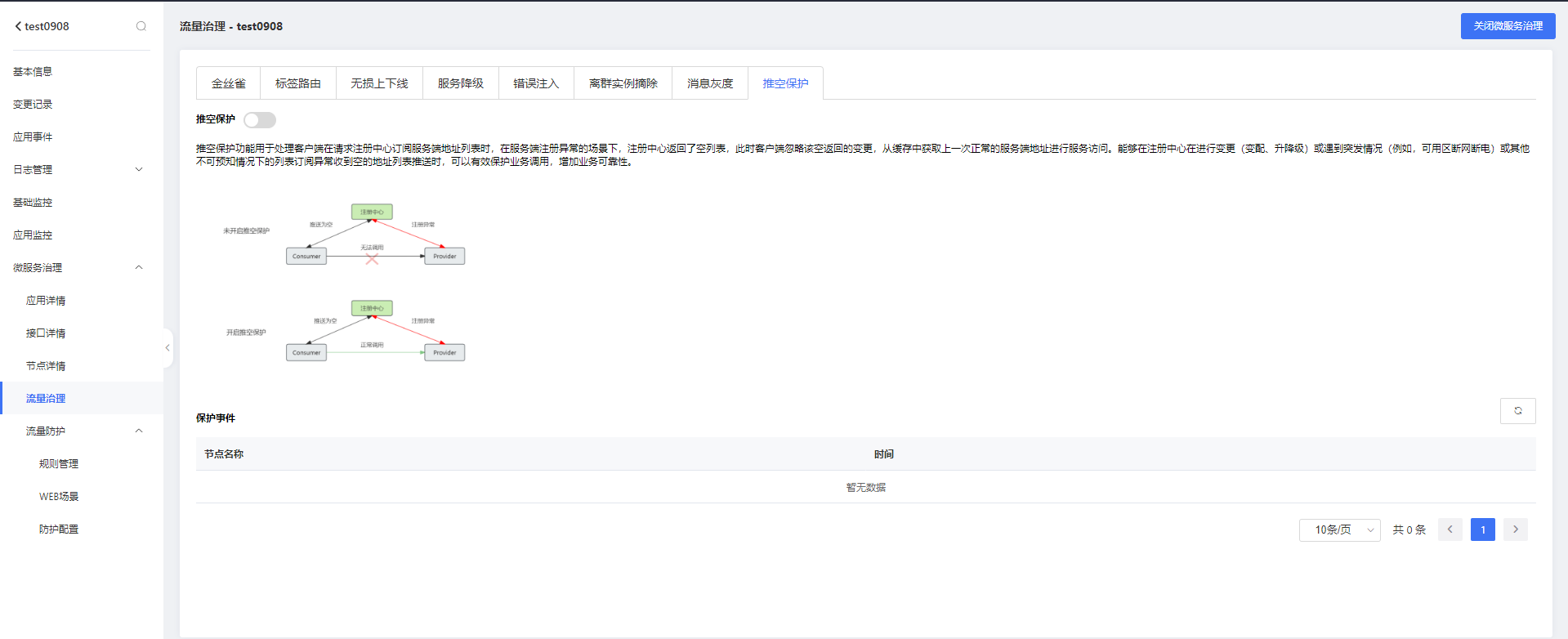 应用基础信息页面,选择 微服务治理 > 流量治理,单击 推空保护