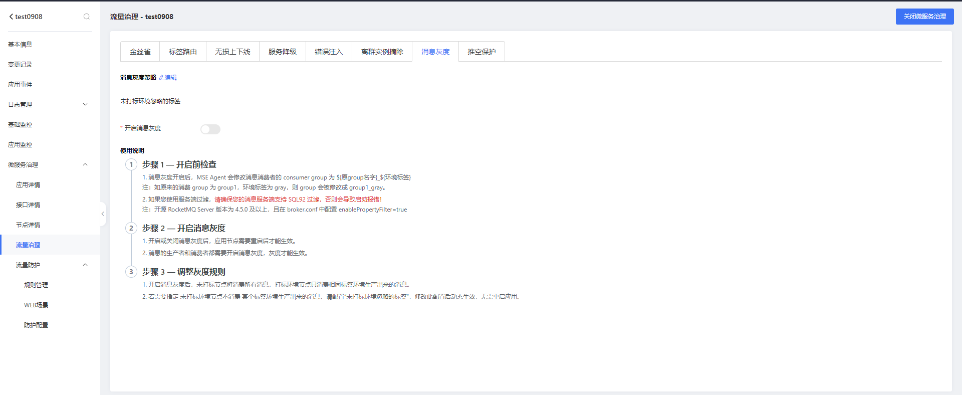 4. 应用基础信息页面,选择 微服务治理 > 流量治理,单击 消息灰度