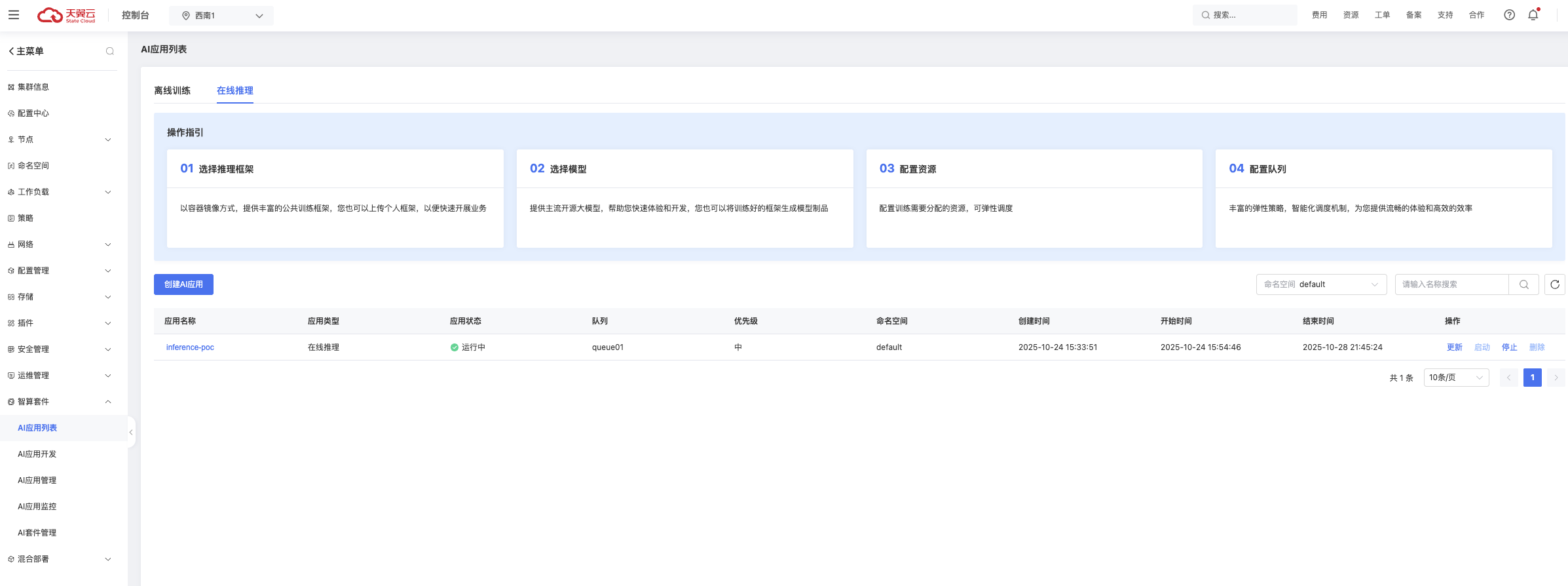 在智算套件控制台,点击“创建AI应用”,进入应用配置页面。