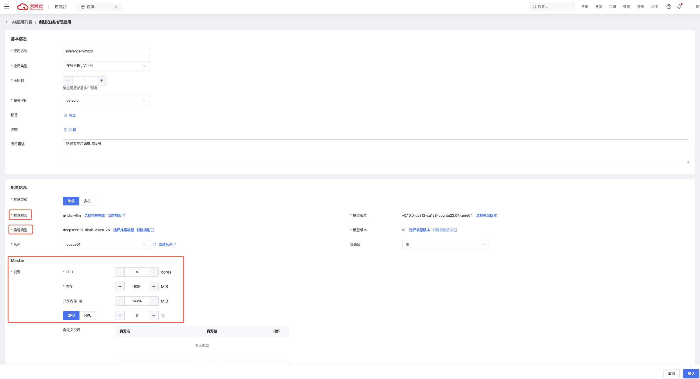 填写应用基本信息,设置推理框架、推理模型、推理资源等信息,点击“确认”,创建推理应用。